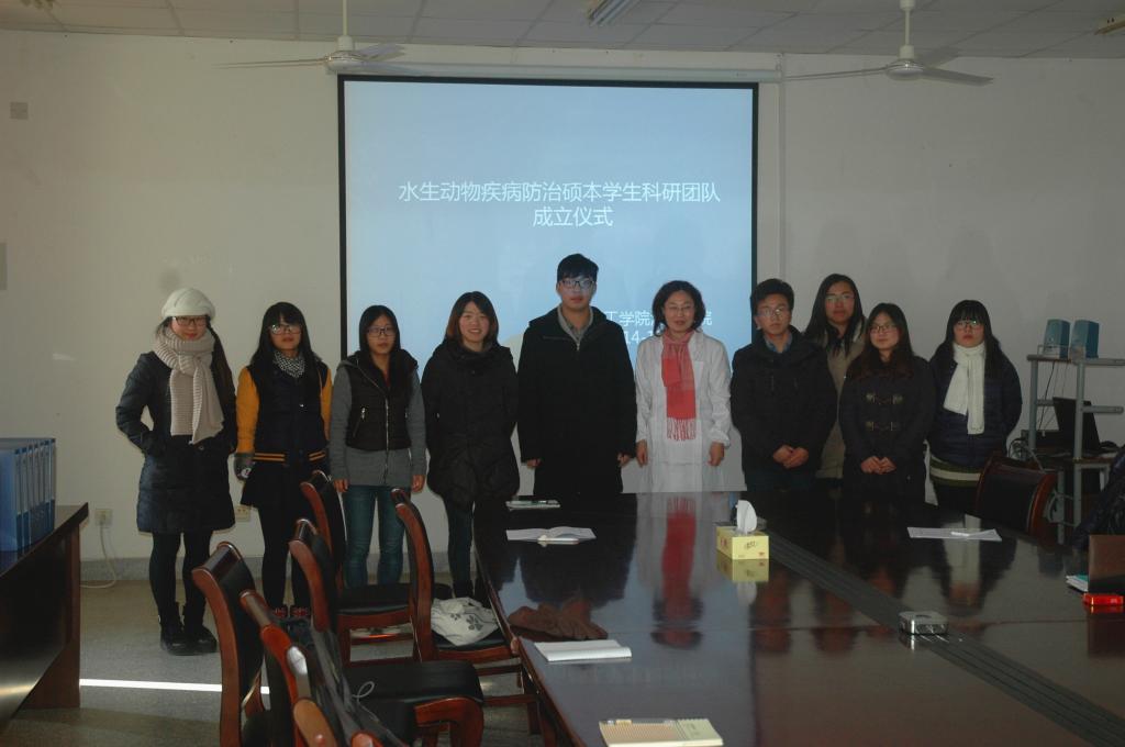 2014年12月8日,水生动物疾病防治硕本学生科研团队成立仪式在海洋南楼202室正式启动。淮海工学院海洋学院党委书记杜修桥、党委副书记马志同、团队指导老师张晓君、团队学生代表等参加了本次仪式。