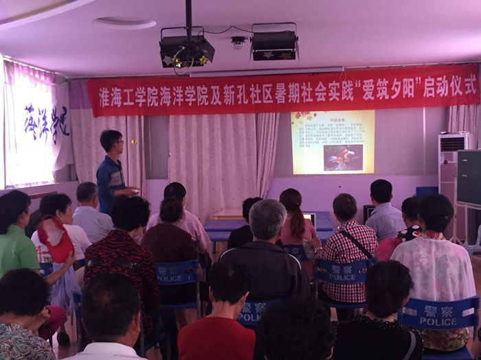 仪式伊始,项目负责人丁锦屏同学首先总结了过去一年在新孔社区举办的各项活动,如婆婆妈妈大舞台、重阳节包饺子、三八节趣味运动会等等,实践小组在得到新孔社区居民们肯定的同时,活动也受到连云港多家新闻媒体的报道,得到广泛的社会关注。本次“爱筑夕阳”暑期社会实践活动,学生们将继续陪伴老人,给更多的老人们带来温暖。活动介绍中,主持人认真的语调让在场的所有人都微微动容,老人们都听得很认真,当提到垂钓大赛、趣味运动会等活动计划时,现场气氛非常热烈,这些接地气的活动让老人们充满了期待。