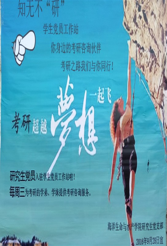 为了发挥研究生党员的独特优势,2016年9月28日,海洋生命与水产学院在学生党员工作站开展了以知无不“研”为主题的考研帮扶活动,活动由研究生党支部承办,此项活动将在本学期的每一个周三延续开展。