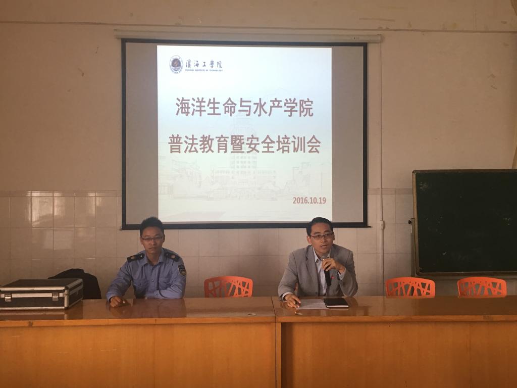 2016年10月19日下午,海洋生命与水产学院在海洋北308会议室开展普法教育及安全培训会,会议由申欣副院长主持,全体教职工参加培训会。