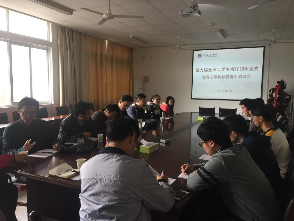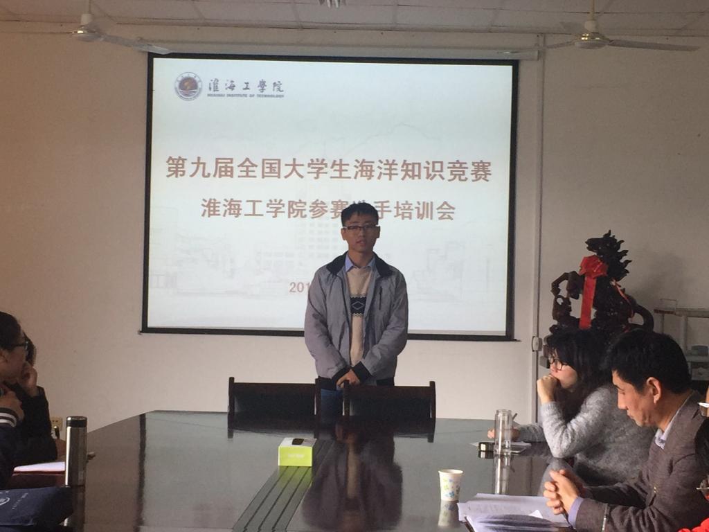 团委、学生会的大力支持下,作为丝绸之路经济带和21世纪海上丝绸之路的交汇点和“桥头堡”连云港的淮海工学院大学生代表,海洋生命与水产学院海科151班级叶琦同学参加了本次大赛并成功进入全国决赛圈。2016年10月30日上午,海洋生命与水产学院开展了第九届全国大学生海洋知识竞赛淮海工学院参赛选手培训会。学校团委郭戈老师、校学生会代表、海洋生命与水产学院团委副书记王静、海洋科学系多位教师及小企鹅海洋保护协会感兴趣的同学参加了培训会。