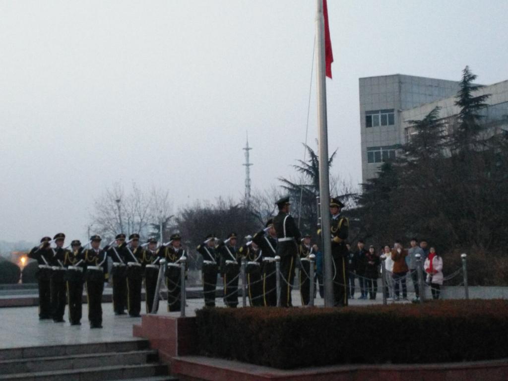 6点30分,国旗仪仗队的同学们迈着铿锵有力的步伐走到升旗台上,全场一片肃静。在激昂的《义勇军进行曲》中,在初升的太阳映照下,鲜艳的五星红旗随着旗手振臂一挥,徐徐展开,迎风飘扬在淮海园的上空。大家集体行注目礼。