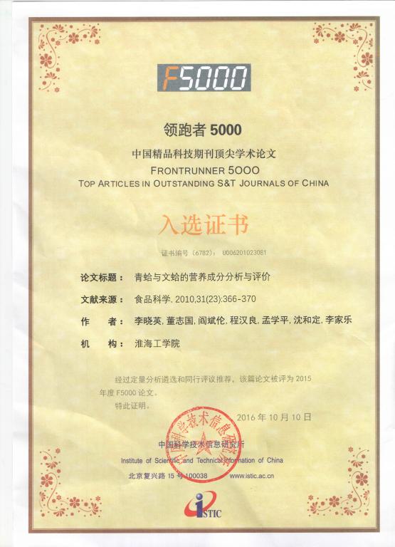 近期,科技部中国科学技术信息研究所公布了2015年度“领跑者5000——中国精品科技期刊顶尖学术论文(F5000)”。经过定量分析遴选和同行评议推荐,羞羞漫画 海洋生命与水产学院李晓英老师撰写的论文“青蛤与文蛤的营养成分分析与评价”成功入选(证书编号:U006201023081)。该论文发表在2010年的《食品科学》(第31卷第23期:366-370)上。