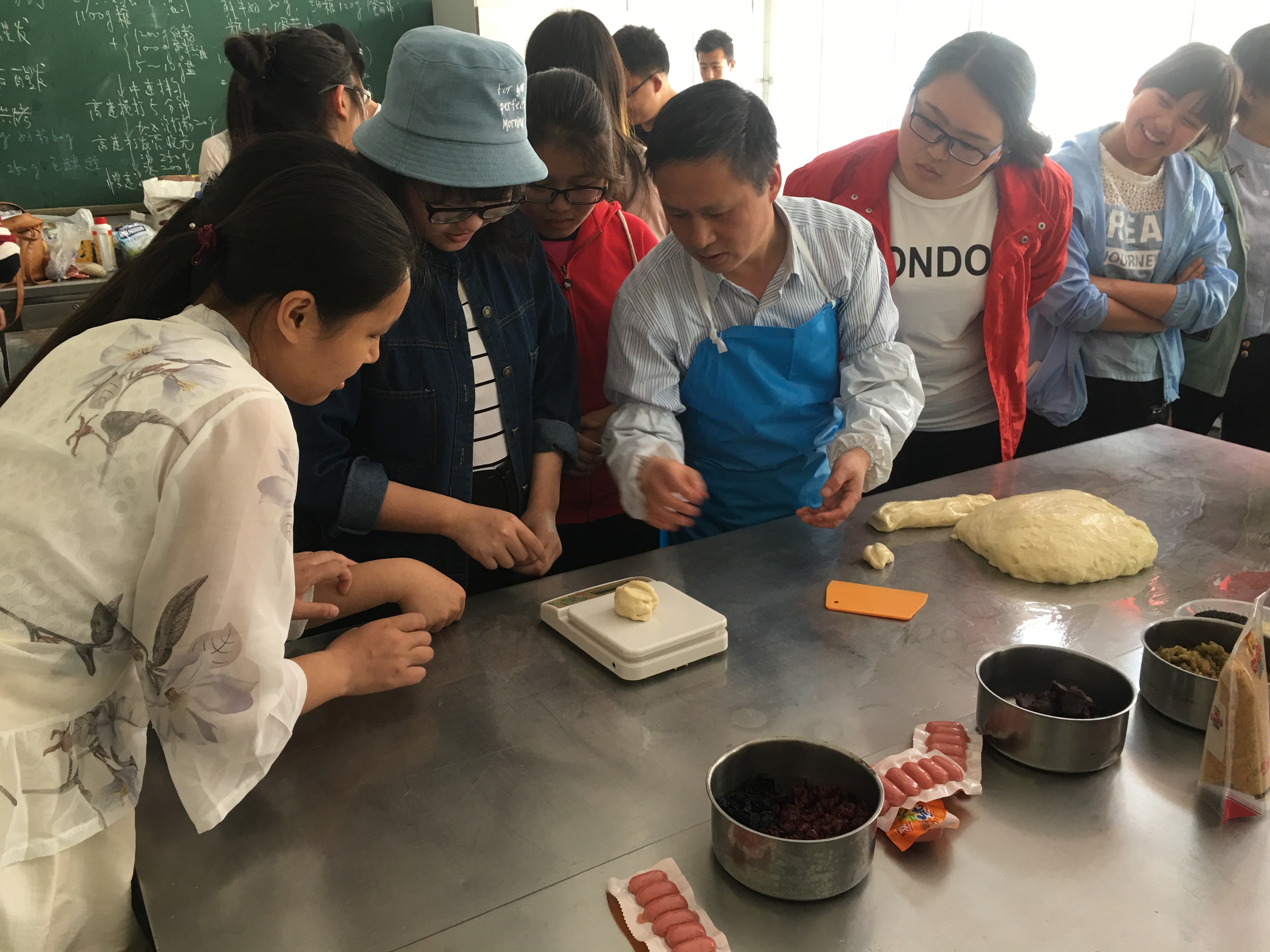 比赛伊始,指导老师舒留泉仔细介绍并示范了面包制作流程,“切面块称重80g,虚握面团揉捏成为半圆,把面饼折叠切块,弯曲形成爱心状,同学们要开动脑筋,享受制作……”参赛选手们牢牢记住舒老师说的每一个字,蓄势待发等待比赛开始。自由制作期间,选手们迫不及待地开始讨论并分工,势必要做出最别出心裁的面包。从称重、造型、加料、再到烘烤、刷蛋液、涂沙拉酱,每个环节都事无巨细。食品工艺室里此起彼伏的传出讨论声:“我觉得还是圆形比较好!”“记得多撒点芝麻!” 有的组做成海星状,有的组做成小熊状,有的组做成爱心状,有的做成螺旋状……团队齐心协力的景象为食品工艺室增添了许多温馨。