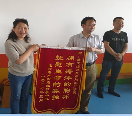 5月17日下午,值2017年全国助残日来临之际,海洋生命与水产学院实验中心党支部全体党员在学院党委书记王波的带领下,来到连云港市新启缘特教中心举行“关爱星儿、排遣孤独”的党日活动。连云港新启缘特教中心是一所民办专门排解幼儿孤独症的教育机构,为帮助特教中心美化教室环境、丰富特殊儿童们的业余生活,学院向特教中心赠送水族箱和观赏鱼。