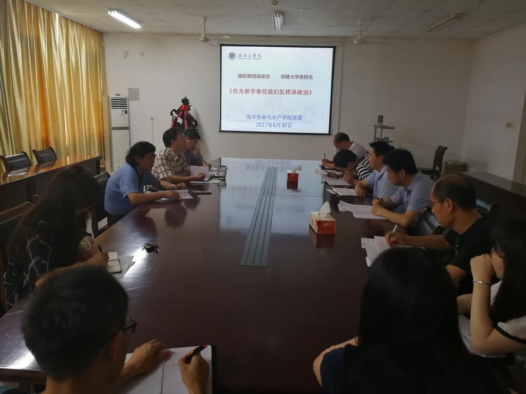 6月30日下午,海洋生命与水产学院以“作为教学单位我们怎样讲政治”为主题召开专题研讨会,学院领导、各党支部书记参加会议。这次研讨是在各支部学习习近平总书记讲话精神基础上,结合赵炳起书记6月28日《旗帜鲜明讲政治,凝聚力量促发展》专题党课精神,围绕学院当前工作情况而进行的。