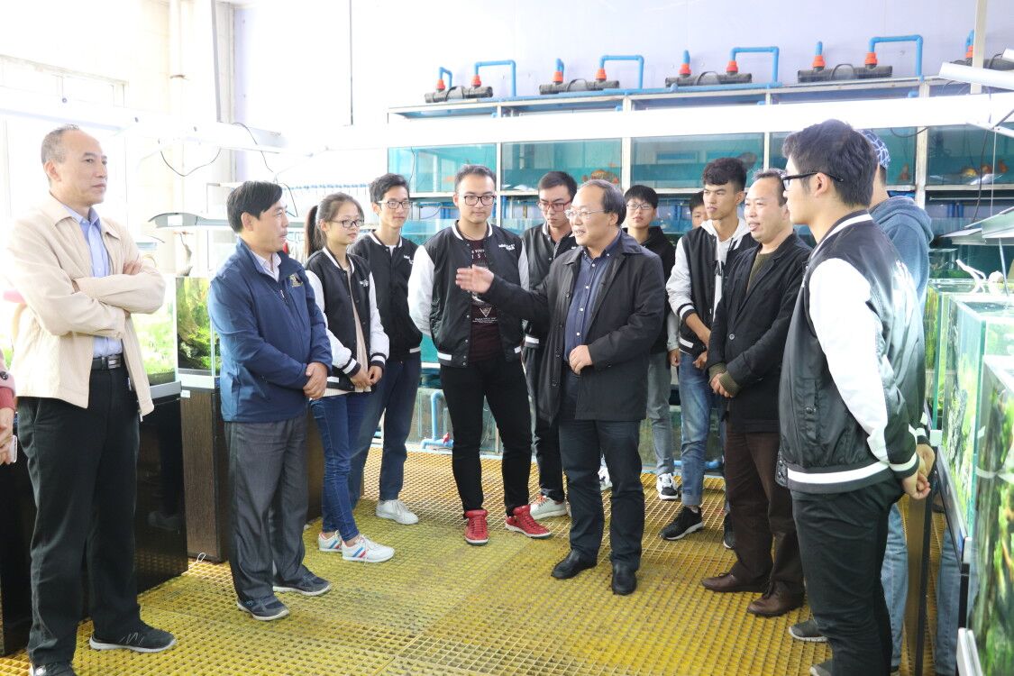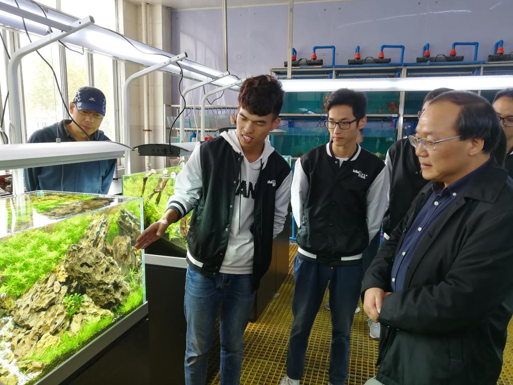 接着,与会师生走进海洋学院水族箱实验室,参观水族箱造景的练习作品。获奖同学为参观师生介绍作品的创作思路。“这是《高山深涧》,这个作品是利用青龙石作主体造型,上方分别用绿色和红色水草展现辽阔的远景,中间用白沙表现淙淙溪流,在底部点缀一些牛毛草衬托山高溪深,表现出山水之美……”面对参赛选手的娓娓道来,现场师生连连称赞。