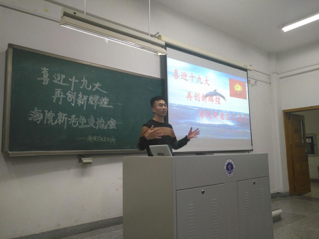10月18日,院团委在文通A楼211开展了青春故事分享会。校学生会副主席孙施乐,给新生分享自己的大学故事的同时鼓励新生们向着初心的目标努力奋斗,不忘初心,方得始终,激励和告诫新生青春就要多“折腾”,但大学的学习生活中依旧要自律,要树立自信,要积极向上。海院青年志愿者协会会长史向港则向新生们展示了丰富多彩的暑期社会实践活动,鼓励新生们多参与实践,丰富大学生活,牢记实践才是检验真理的唯一标准。生技152班的印汉学长和新生们分享了他远赴韩国留学的各种趣事,通过自己的亲身体会给同学们讲解留学生活揭开了同学们最为好奇的神秘面纱;最后水产161的宋杰则简短有力,介绍水族箱造景的程序的同时用自己的切身体会告诉大家努力终究会有回报。在谈到水族箱制作的过程时,他说:“每天你们以为自己每天披星戴月,可在我们看来却不过是最令人羡慕的清闲时光。”
