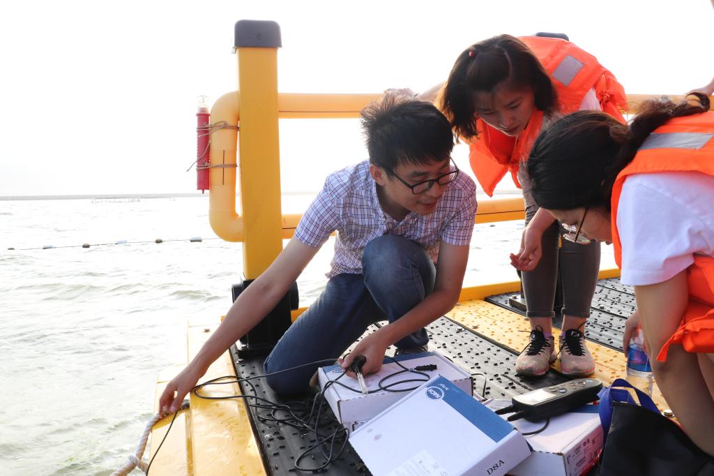 金校长一行亲切询问了实践队员的学习及活动开展情况后,与实践团队们一起来到海上实验平台。实验平台的负责人徐军田教授详细地介绍了平台的资金投入、材料建造、功能应用等。他说道,海上试验平台作为重要海上研究基地,突破了传统上实验室受控实验完成的海洋生态系统问题,能准确反应自然海区内海洋生态系统的变化,为海水养殖活动提供有效的监测数据。在平台工作人员的指导下,实践队员们结合专业优势,开展了海区环境的实时监测。
