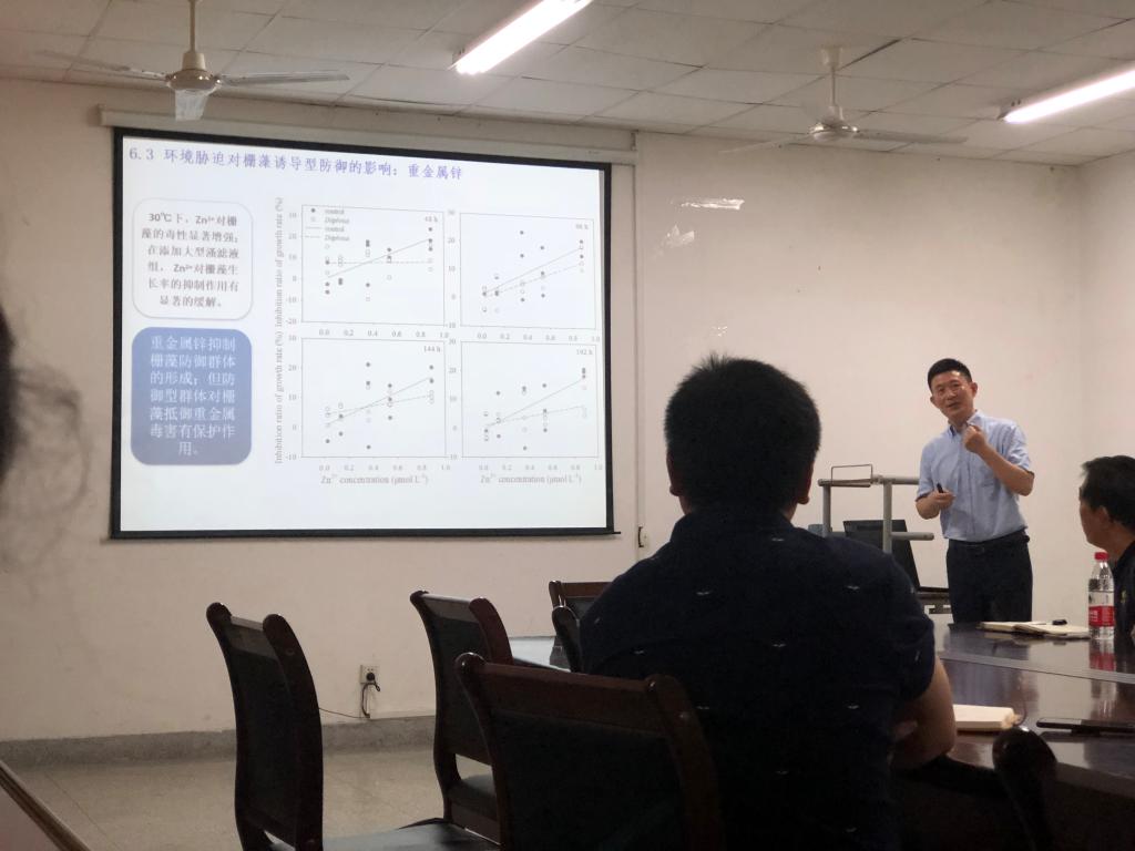 杨教授的报告中讲到在生态系统各营养级中,许多生物为了抵御较高营养级的捕食作用,在与其捕食者的长期协同进化过程中形成了多种多样的防御方式。防御方式按防御的时效性可分为诱导型防御和组成型防御。栅藻(Scenedesmus spp.)是一类具有典型诱导防御的藻类,在全球范围内的淡水水体中广泛存在。栅藻能够响应牧食者信息素,形成4细胞、8细胞甚至更多细胞的真定型群体。防御理论认为,任何形式的防御均伴随着代价的付出。栅藻形成防御群体后,由于比表面积的降低,导致“包裹效应”和较高的沉降速率,因此栅藻的诱导型防御必然伴随着代价的产生。报告从如下6各方面分别阐述,1、栅藻诱导型反牧食防御群体形成的条件;2、栅藻诱导型反牧食防御群体形成的发现;3、栅藻诱导型形成的反牧食效果(益处);4、诱导型防御对维持种群稳定性的作用;5、诱导型防御群体形成的原因分析;6、栅藻诱导型反牧食防御在资源可得性降低时的权衡策略与代价分析。本研究发现,在资源受限、竞争、环境胁迫等条件下栅藻在形成防御群体时伴随着显著的直接代价,且存在防御策略的权衡策略,本研究结果完善了栅藻诱导型反牧食防御理论,对于推动种间关系的研究也具有重要意义。