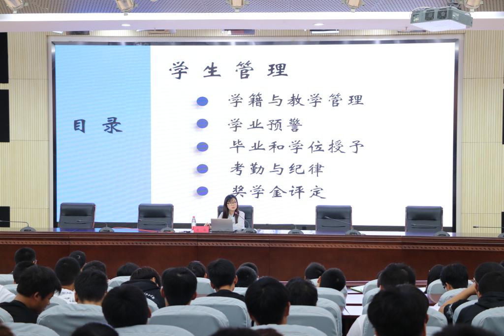 报告伊始,唐瑶介绍了《学生手册》的重要性,强调它不仅是学校对学生进行管理的依据,更是同学们学习、生活、行为规范的指导性文件。接着,她结合丰富的学生工作经验,用鲜活的学生工作案例从学籍与教学管理、学业预警、毕业与学位授予、考勤与纪律、奖学金评定等五个方面进行了详细地讲解,对新生在校的学习、生活等各方面进行了行为规范,帮助新生们更快、更全面地了解校规校纪,熟悉学籍和教务管理等相关细则。会上,她强调同学们要意识到规范自我行为的重要性,严于律己、积极进取,做好规划,为今后的校园生活做好准备、打下基础。