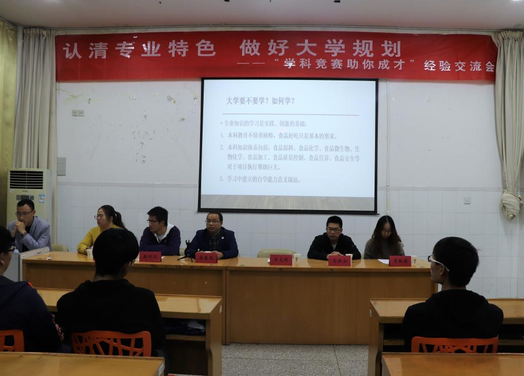 为了让学院食品与生物工程专业新生更好了解专业,热爱专业,规划自己的未来。10月26日晚,“认清专业特色,做好大学规划”——学科竞赛经验交流系列活动在海洋北楼308召开,食品与生物工程系主任盘赛昆、教师王文彬,学生代表刘丹丹、桑雨浓、高云山、肖敏婧担任活动嘉宾,食品、生工全体18级新生参加了本次活动。