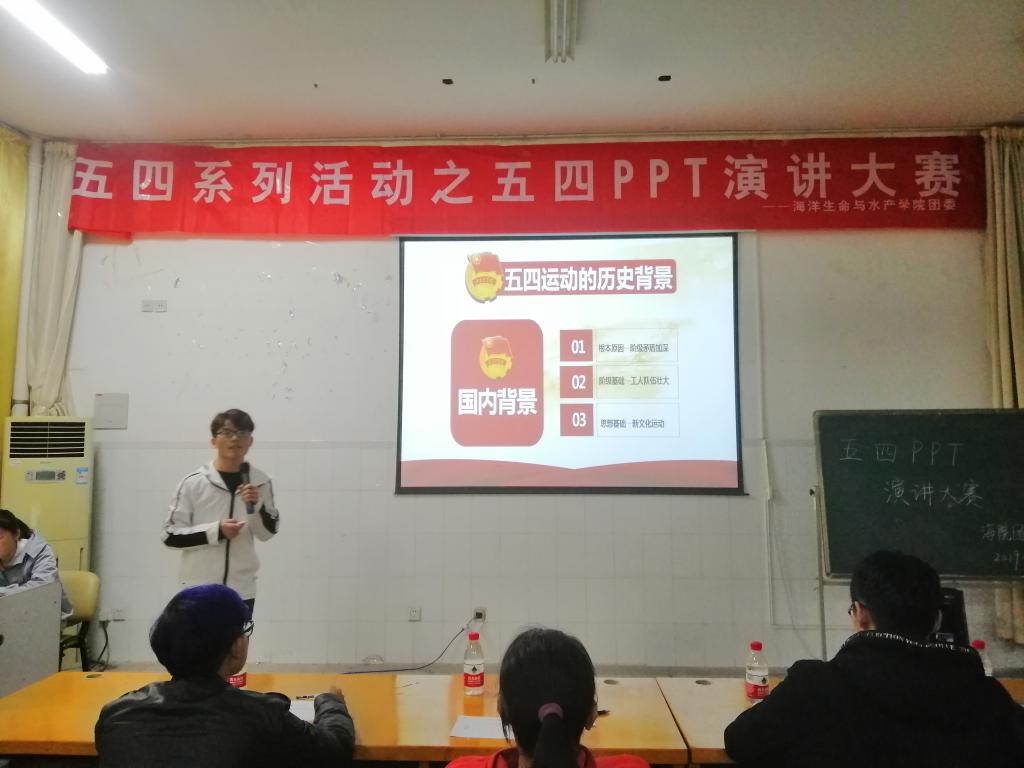 为纪念五四运动100周年,4月27日晚,海洋生命与水产学院在海洋北楼308成功举办了“五四少年说”PPT演讲大赛。学院辅导员王晨曦,学生干部朱志豪、胡先泽、盛扬杰担当本次活动评委。