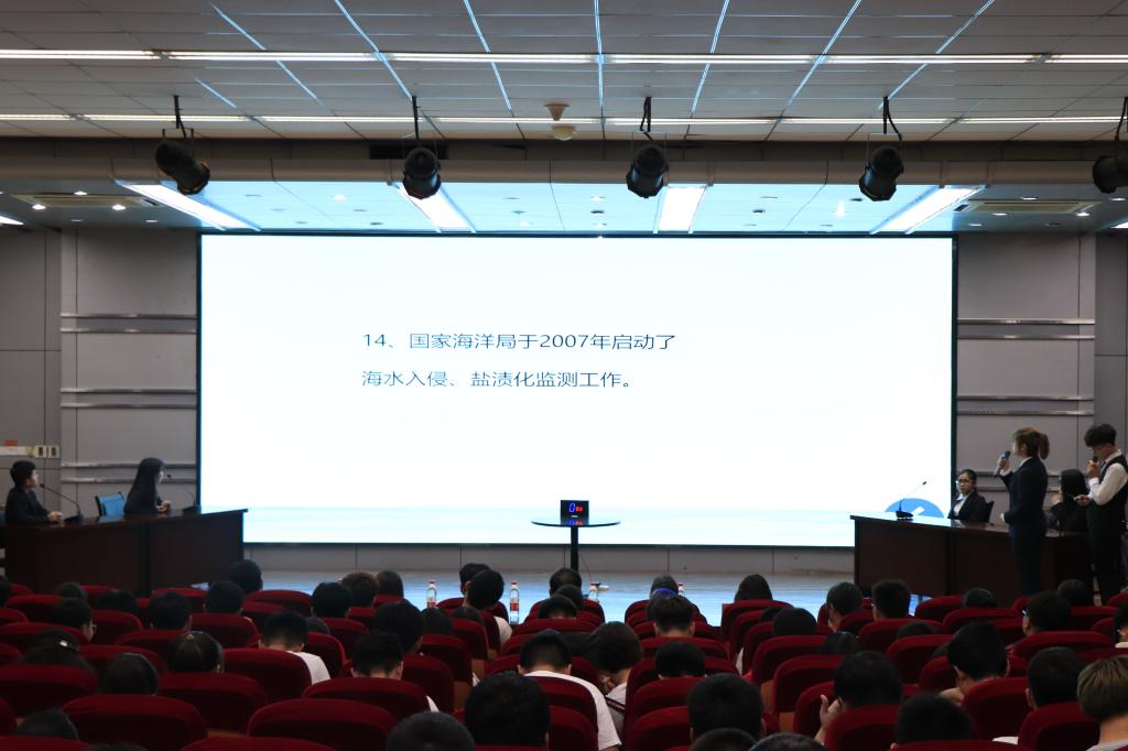 决赛共分为三个环节,分别为“过关斩将”“谁与争锋”和“巅峰对决”。在答题环节和抢答环节中,每个选手表现踊跃,展现出了自己真正的实力,比赛气氛甚是热烈。在演讲环节,最终晋级的三位选手分别从海洋军事、海洋政策法规以及海洋经济产业三个方面阐述了自己对于海洋的见解。在场的观众们也在紧张的氛围中不知不觉地记忆、理解和领悟着海洋科普知识。赛场上“知识问答”和“你画我猜”的观众互动环节也增添了比赛的趣味。最后,指导教师李联泰老师给予了精彩的点评,他希望同学们能够结合专业知识,发挥个性特长,努力实践,有所收获。