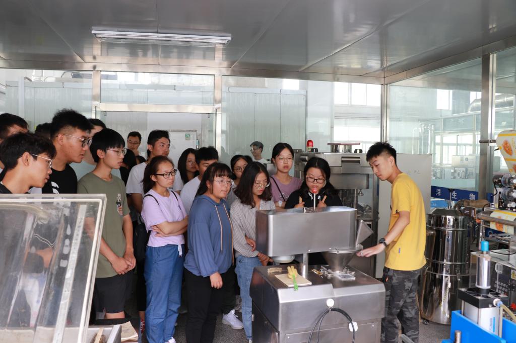活动的最后食品系同学们参观了食品车间,18级研究生周振详细地从原料选择、配料比例调和、压制成型再到烘焙、质检、包装的工艺制作流程等方面进行讲解,让同学们初步了解到食品加工的专业学习,开阔了眼界,为今后更加深入学习食品加工专业打下基础。