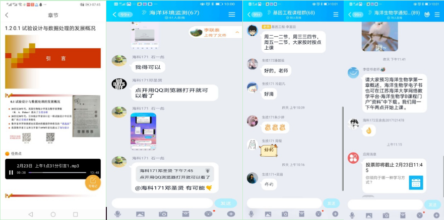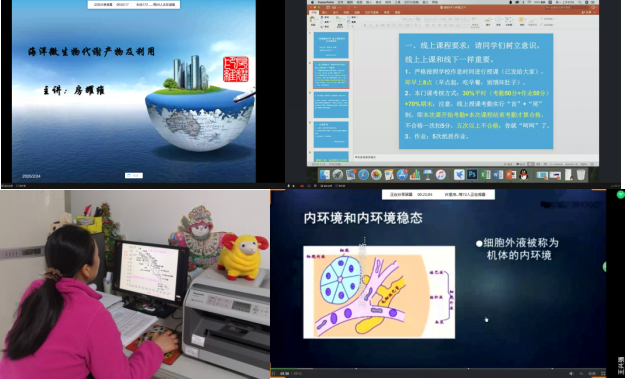 为了应对本次新型冠状病毒肺炎疫情防控对教学工作造成的影响,切实做好“停课不停教,停课不停学”,努力将疫情防控对教学工作的影响降到最低,根据学校的统一布署,学院精心组织开展本次线上教学的各项工作,出台了《海洋生命与水产学院(食品科学与工程学院)新型冠状病毒感染的肺炎疫情防控期间本科教学工作实施方案》《海洋生命与水产学院(食品科学与工程学院)疫情防控期间在线教学突发事件应急预案》《海洋生命与水产学院(食品科学与工程学院)新型冠状病毒肺炎疫情防控期间本科教学督导工作方案》《海洋生命与水产学院(食品科学与工程学院)2019-2020-2学期期初教学检查方案》。全体老师充分认识到本次线上教学开展的重要意义,认真进行教学资料的准备、学习各种智慧教学工具的使用,形成了各门课程的教学方案。为了能够为广大教师提供有效的技术支撑,学院成立了技术保障组,每个教学系由一名比较精通智慧教学工具使用的教师负责技术支持工作。