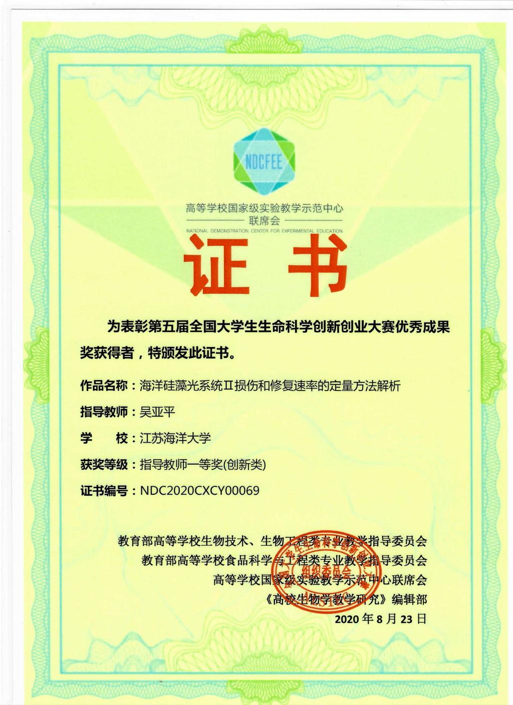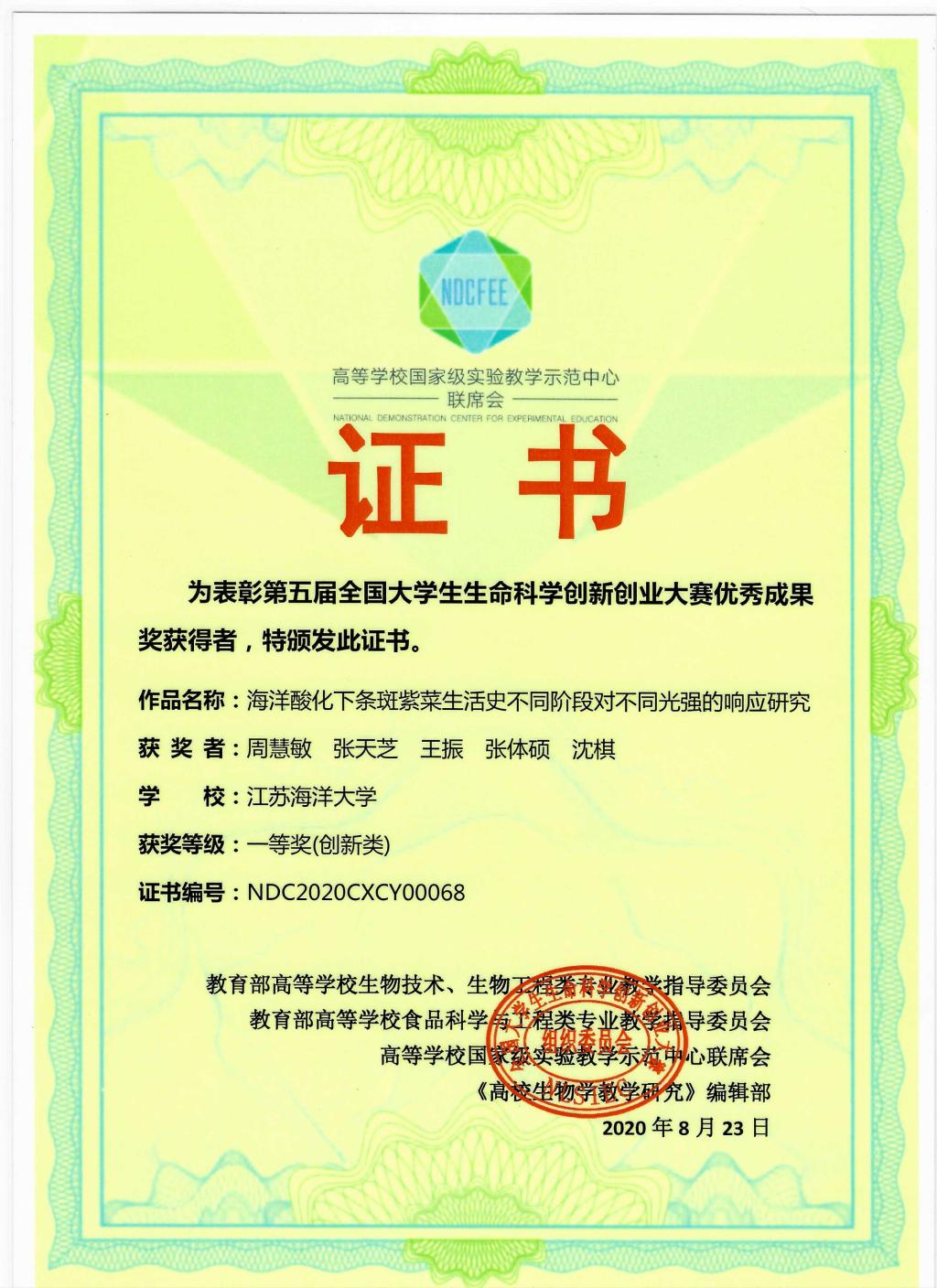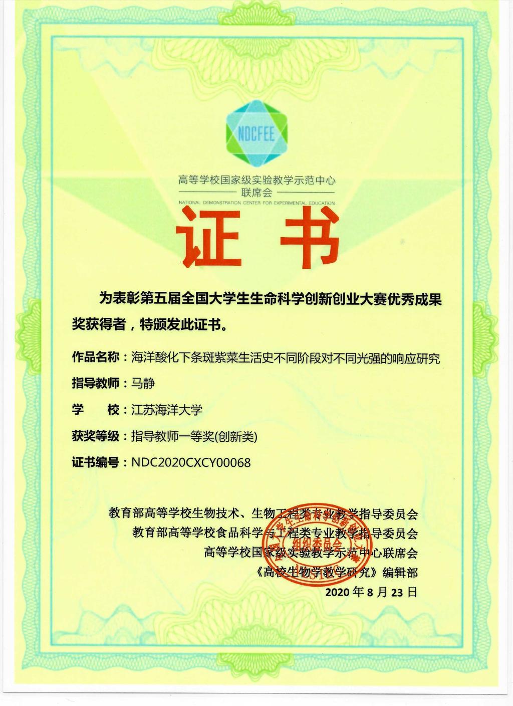 参赛作品“海洋酸化下条斑紫菜生活史不同阶段对不同光强的响应研究”(学生:周慧敏、张天芝、张体硕、王振、沈棋,指导教师:马静)和“海洋硅藻光系统Ⅱ损伤和修复速率的定量方法解析”(学生:张梦娟、吴心宇、黄晶晶,指导教师:吴亚平)在本次大赛决赛中凭借突出的科研成绩、出色的答辩最终获得两项一等奖。