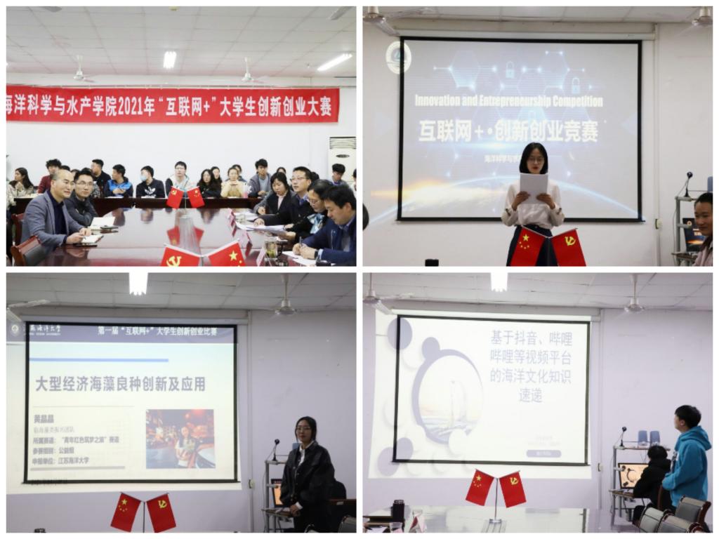 在海洋南楼202会议室举办2021年“互联网+”大学生创新创业大赛,共有34组队伍参与本次大赛。经过紧张激烈的角逐,最终《基于二氧化碳休眠技术的虾类智能储运系统》等项目荣获大赛一等奖,《大型经济海藻良种创新及应用》等项目荣获大赛二等奖;《基于抖音、bilibili等平台的海洋知识文化新闻速递》等项目获得大赛三等奖。