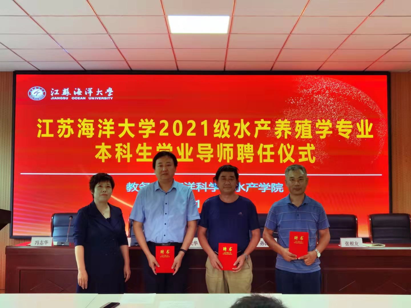 2021级水产养殖学专业本科生学业导师的决定》,孙国红副处长、杨天华书记、徐军田院长共同为23位学业导师颁发了聘书。