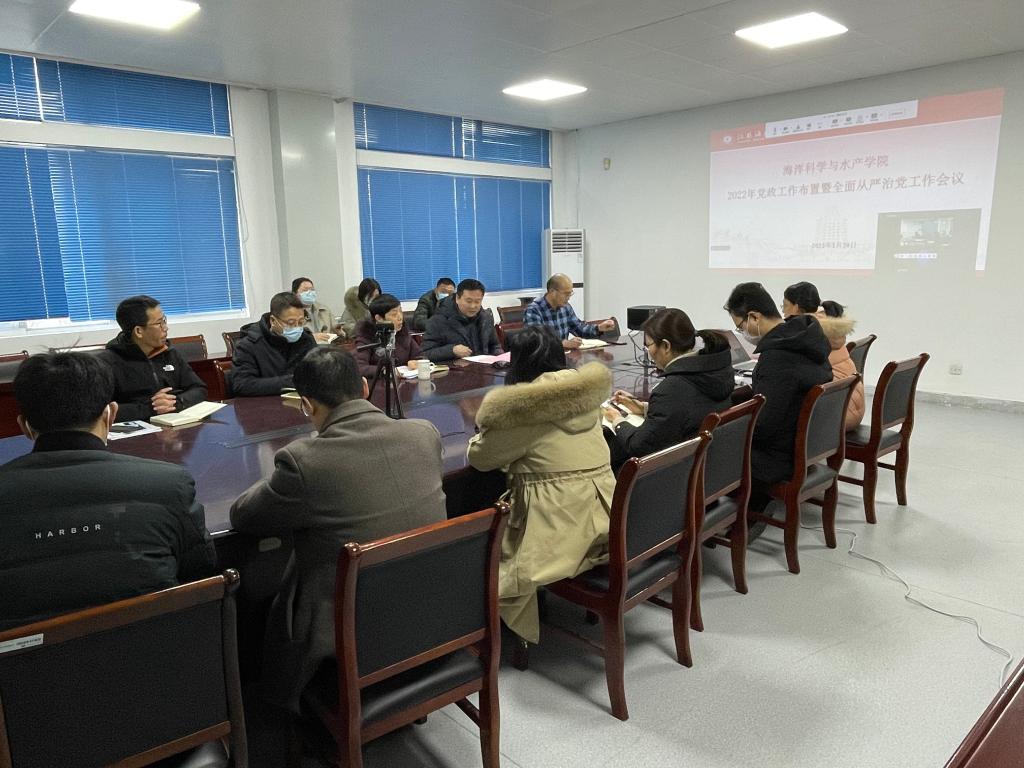 召开2022年党政工作布置暨全面从严治党工作会议。结合疫情防控要求,本次会议采用线上线下相结合的方式,学院领导班子成员、党支部书记、系正副主任、科室负责人在海洋南楼211会议室线下参会,其余教职工通过腾讯会议平台线上参会。会议由学院党委书记杨天华主持。
