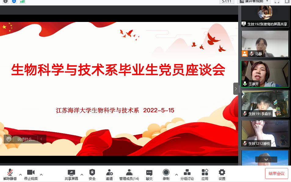 生物科学与技术系毕业生党员座谈会于线上召开。出席本次会议的有生技系教师党支部书记马静、系主任王淑芳、毕业生党员代表以及非毕业生党员代表。