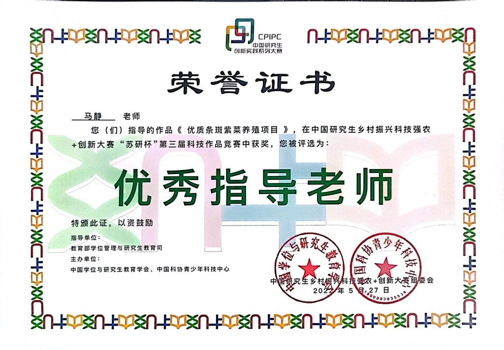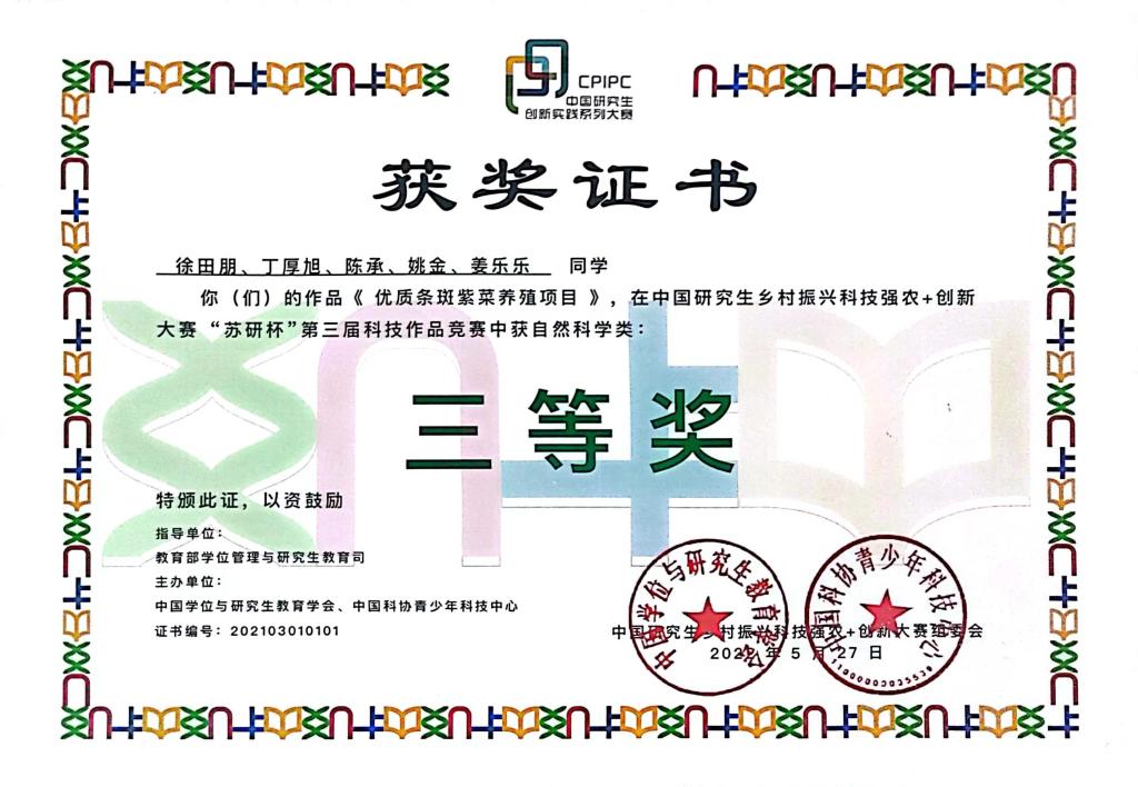 选送的徐田朋、丁厚旭等同学的作品《优质条斑紫菜养殖项目》荣获三等奖,学院马静副教授、王洪斌教授荣获“优秀指导教师”。