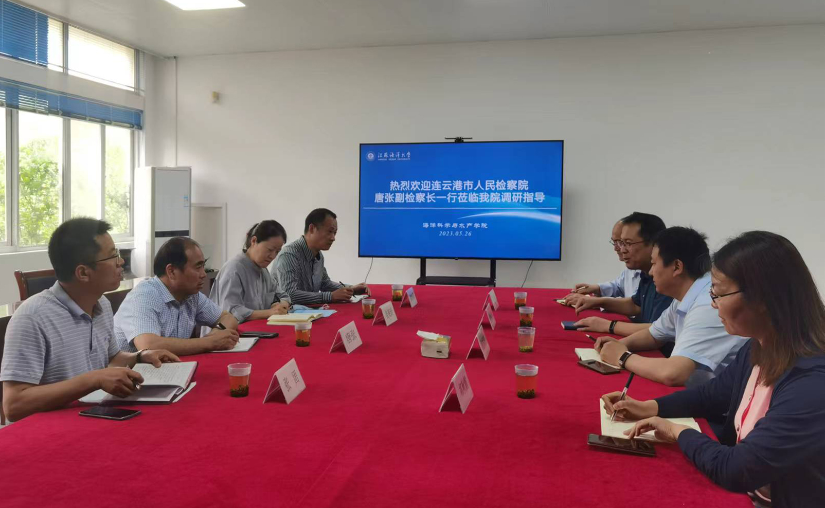 黄金虎对唐张副检察长一行的到来表示热烈欢迎,感谢连云港市检察系统对学院的支持和帮助,希望双方不断加强检校合作,协同贯彻落实党的二十大提出的“发展海洋经济,保护海洋生态环境,加快建设海洋强国”战略部署。徐军田从专业角度介绍了海洋生态环境的影响因素,并详细地介绍了学院的海洋特色。双方就发挥各自优势,寻求合作契合点进行了深入交流。会后,唐张副检察长一行还参观了学校海洋馆。