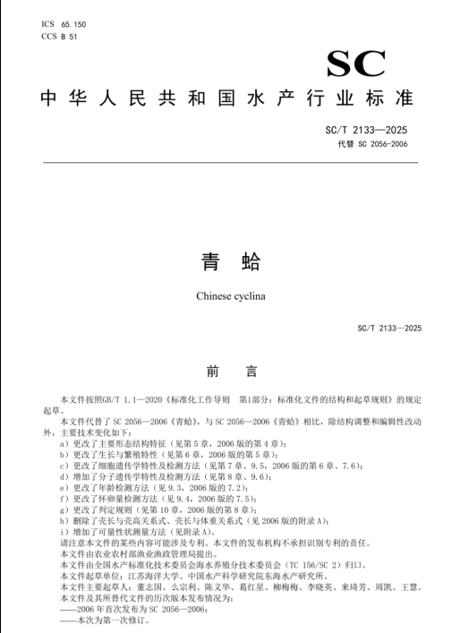 《青蛤》(SC/T 2133-2025)是对原标准SC 2056-2006的修订与升级,文件确定了青蛤[Cyclina sinensis (Gmelin, 1791)]的学名与分类,规定了主要形态结构特征、生长与繁殖特性、细胞与分子遗传学特性,描述了相应的检测方法,规定了判定规则,对促进青蛤产业标准化、规范化发展具有重要意义。