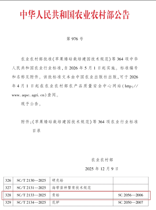 在水产领域科研积累与技术推广能力的重要体现,也是学校服务行业发展、推动产业标准化建设的一项标志性成果。