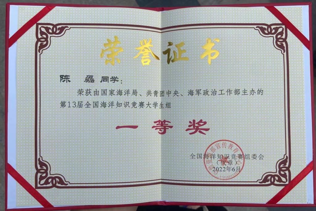 海科192班陈磊同学代表学校参加总决赛,荣获全国一等奖。