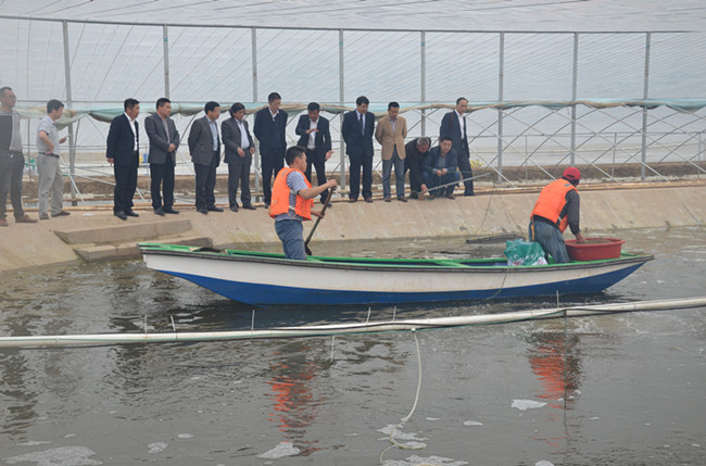 参加揭牌仪式的双方领导与渔场职工一起观看了农场职工腰鼓队的表演后,先后到农场“牧草、家鹅、虾”立体养殖试验塘、饲料公司合作养殖塘、日光棚集约化养虾池塘等处调研指导。