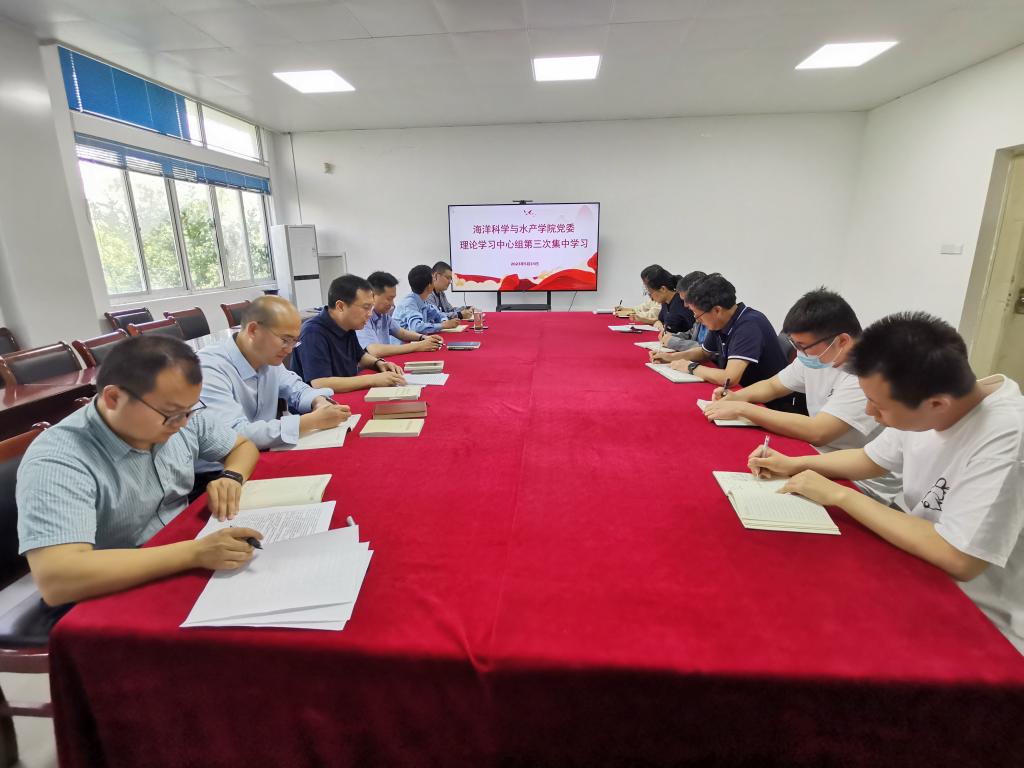 党委理论学习中心组在海洋南楼211室进行本学期第三次集中学习,学院党政班子成员、院党委委员、各党支部书记参加学习会,会议由学院党委书记黄金虎主持。