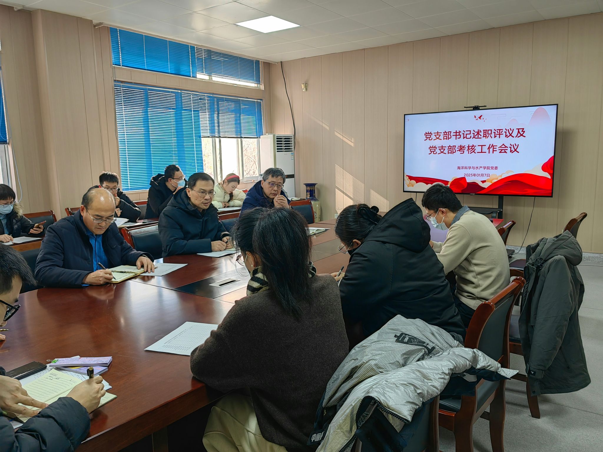 党委在海洋南楼211召开了党支部书记述职及党支部考核工作会议,学院班子成员、党委委员、各支部书记参加会议,会议由党委书记黄金虎主持。