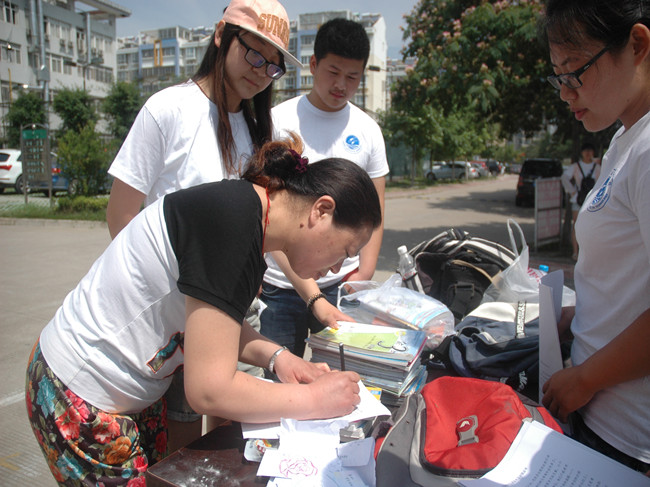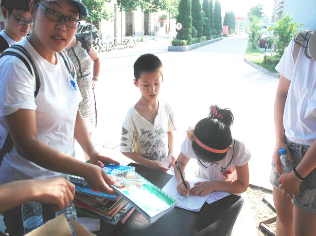 自7月1日起,活动历时五天,在河滨社区居委会的协助下,实践小分队在社区居委会、海连新天居民小区和苍梧小学分别进行宣传并设置捐赠点。7月4日,海院同学来到海连新天居民小区现场宣传,小区居民十分热情地配合,捐书场面尤其壮观。社区居民都十分愿意将闲置书籍捐赠给留守儿童,家长和孩子们都主动在书的扉页上留下签名和美好祝愿。他们坚信,这些捐赠的书籍将会是“一缕缕温暖的阳光洒进每一个孩子的心里”。