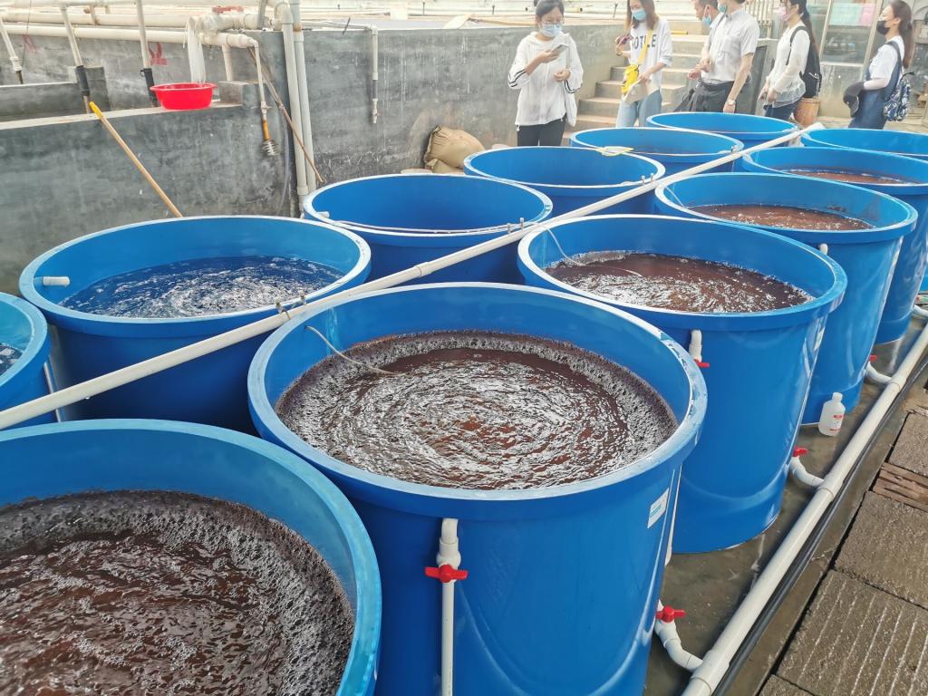下午,实践团队前往黑鲷鱼养殖基地进行参观实践活动。在科研人员介绍下我们了解到黑鲷苗种生产的重要步骤为育苗前的准备工作——调配催产剂及剂量、受精与孵化苗种培育、确定饵料生物与投饵量等。黑鲷育苗用水要求较高,需要水体清洁、新鲜、盐度适中,苗种培育的密度对仔鱼生长速度影响很大。