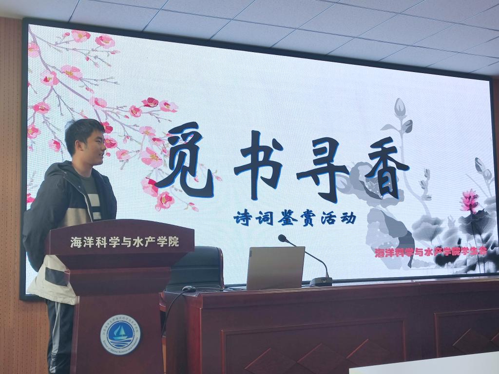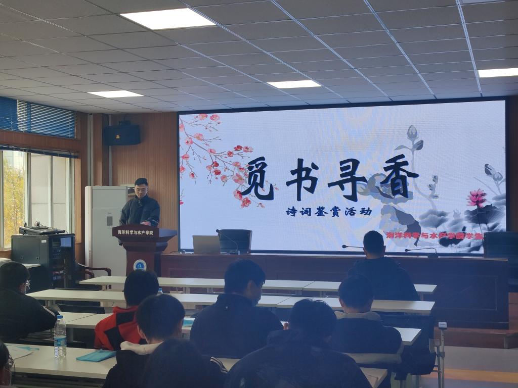 学生会于海洋南楼203室成功举办了“觅书寻香”诗词鉴赏活动。出席此次活动的嘉宾有学院团委副书记唐振新和学生会主席蔡涛丞。