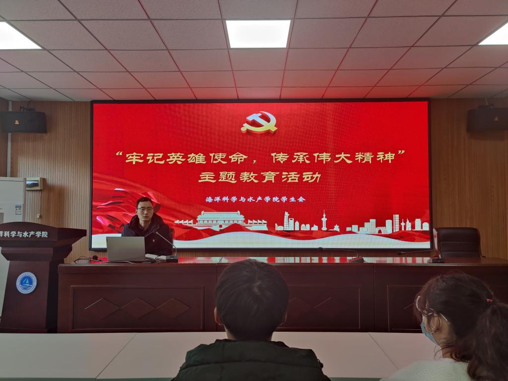 学生会于海洋南楼203举办“牢记英雄使命,传承伟大精神”主题教育活动。本次活动由学院团委副书记唐振新主持。