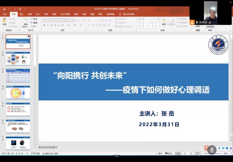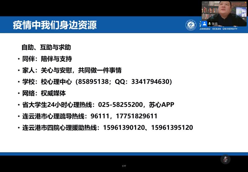 讲座伊始,张岳对讲座各阶段内容进行整体概述,使参会同学了解讲座流程。首先他列出疫情对大家日常生活造成的影响,尤其对毕业生的工作,生活的影响,并提出因疫情所产生的心理焦虑等一系列心理问题都是正常的生理现象,是人类在优胜劣汰中为规避可能对自己造成威胁的人或事所进化出的保护机制。讲座中,张岳给出心理健康标准以用于同学们自测,让同学们能够对自己的心理健康状况进行大致评估。此外,他还针对当前连云港的实际情况给出了诸如心理健康自我管理,保持规律作息,心理咨询专线等切实的心理问题解决方案,为疫情防控期间维护在校学生心理健康指明了方向。