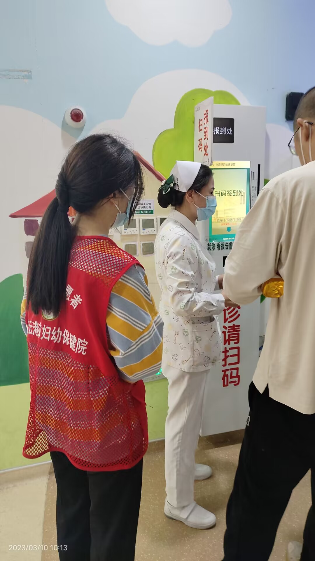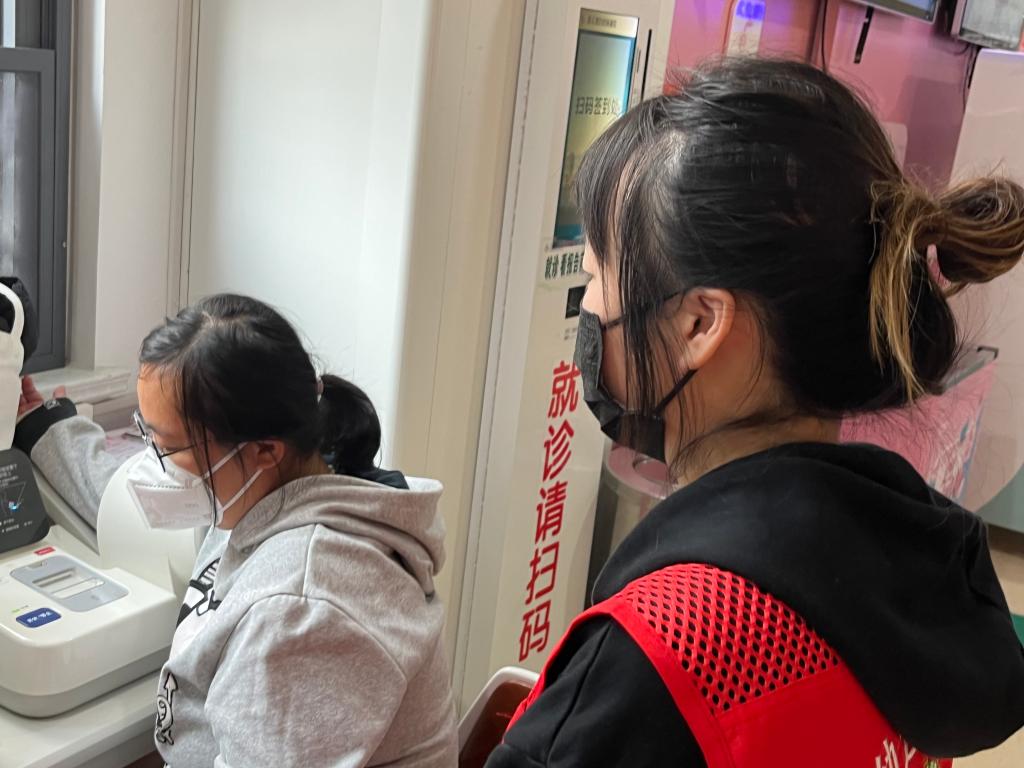 医院工作人员迅速分配好每位志愿者各自的岗位,八位在儿科,其中四位负责扫码挂号,四位负责挂号缴费打印报告;四位在妇科,其中两位负责量血压身高体重,两位负责辅助病人缴费挂号;四位在体检中心,两位负责辅助病人挂号缴费及测量血压身高体重,一位负责打印心电图,一位在超声室辅助记录医生诊断结果。