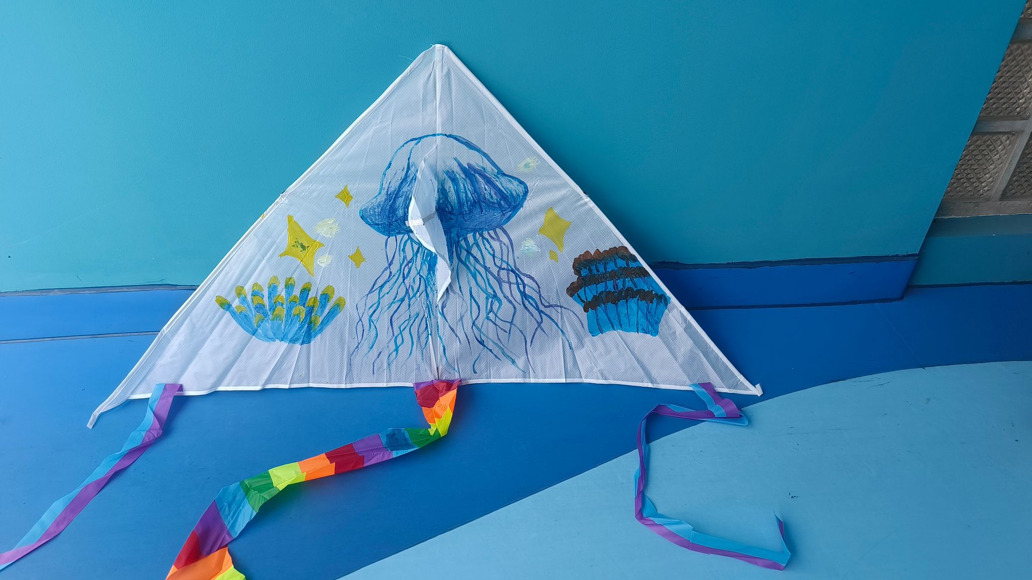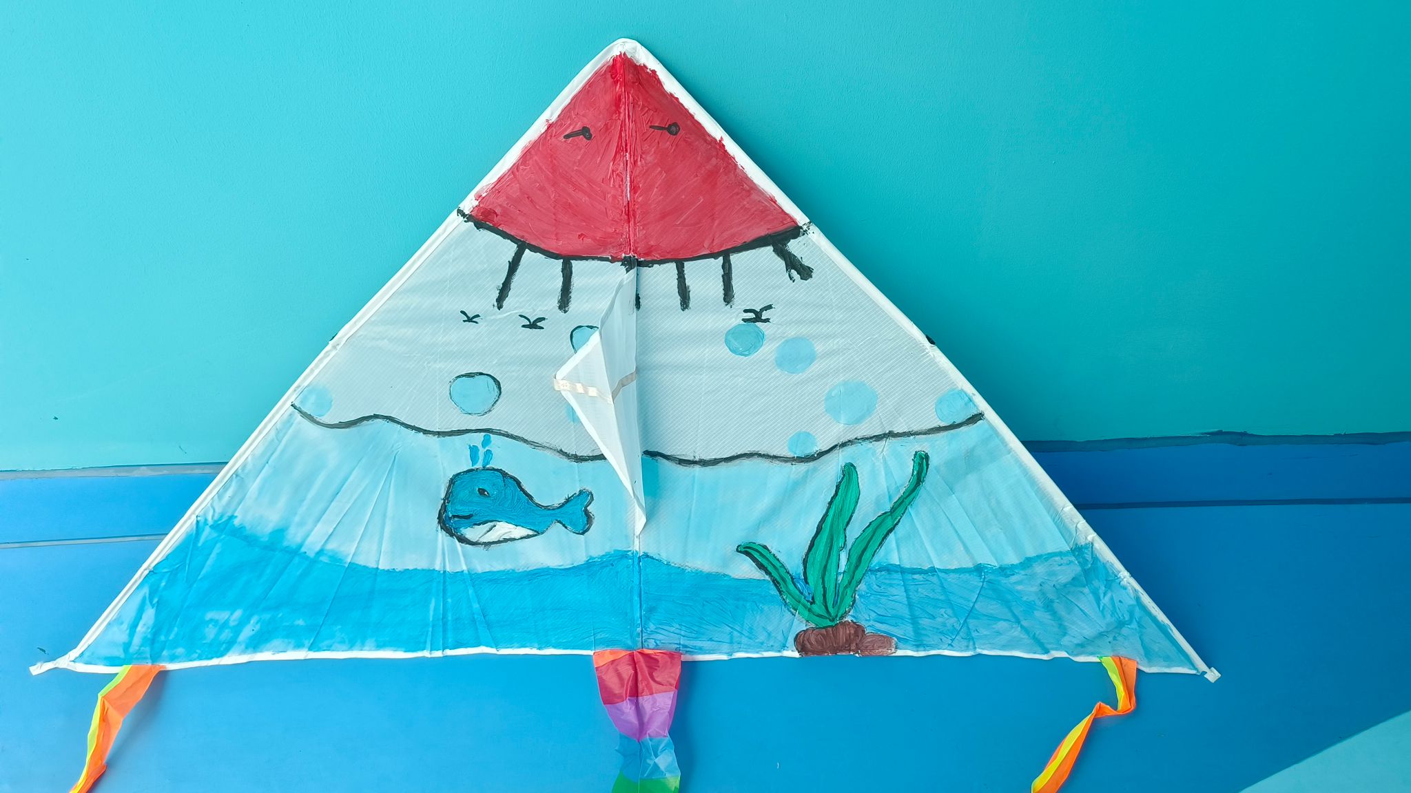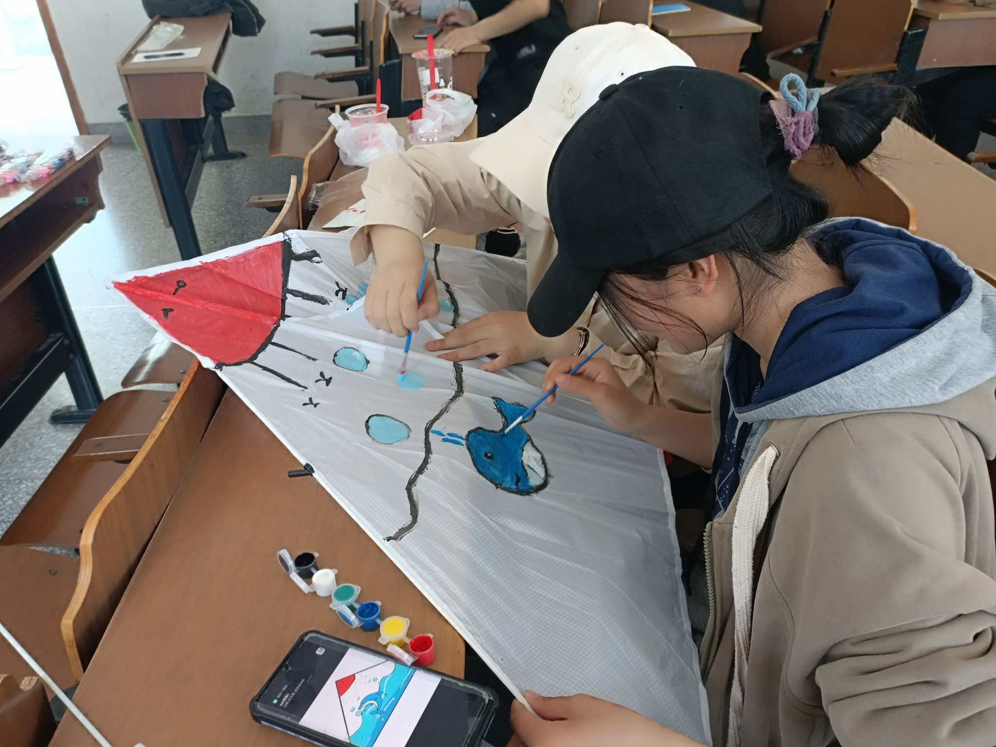 活动伊始,同学们积极参与,按照分组领取风筝制作材料,包括轻质塑料布、竹条和彩色颜料等。他们发挥创意,精心设计并绘制出充满个性和艺术美感的风筝,现场气氛热烈而欢快。在风筝创作过程中,同学们不仅展现了较高的技术水平,更是巧妙地将海洋、传统文化等元素融入其中。有的绘制了鲸鱼和水母,通过色彩、纹理和形状等方面的巧妙搭配运用表现出海洋的神秘、浩渺和宁静感;有的融入了传统文化元素,如京剧脸谱、山水画等,展现出对传统文化的传承与创新;还有的绘制了五彩斑斓的花朵,每一朵都象征着春天的生机与活力,点缀着海底世界的五彩斑斓。彩墨挥洒,在一笔一画中,学生们感受到传统文化的魅力,竞相绘制出属于自己的理想之筝。