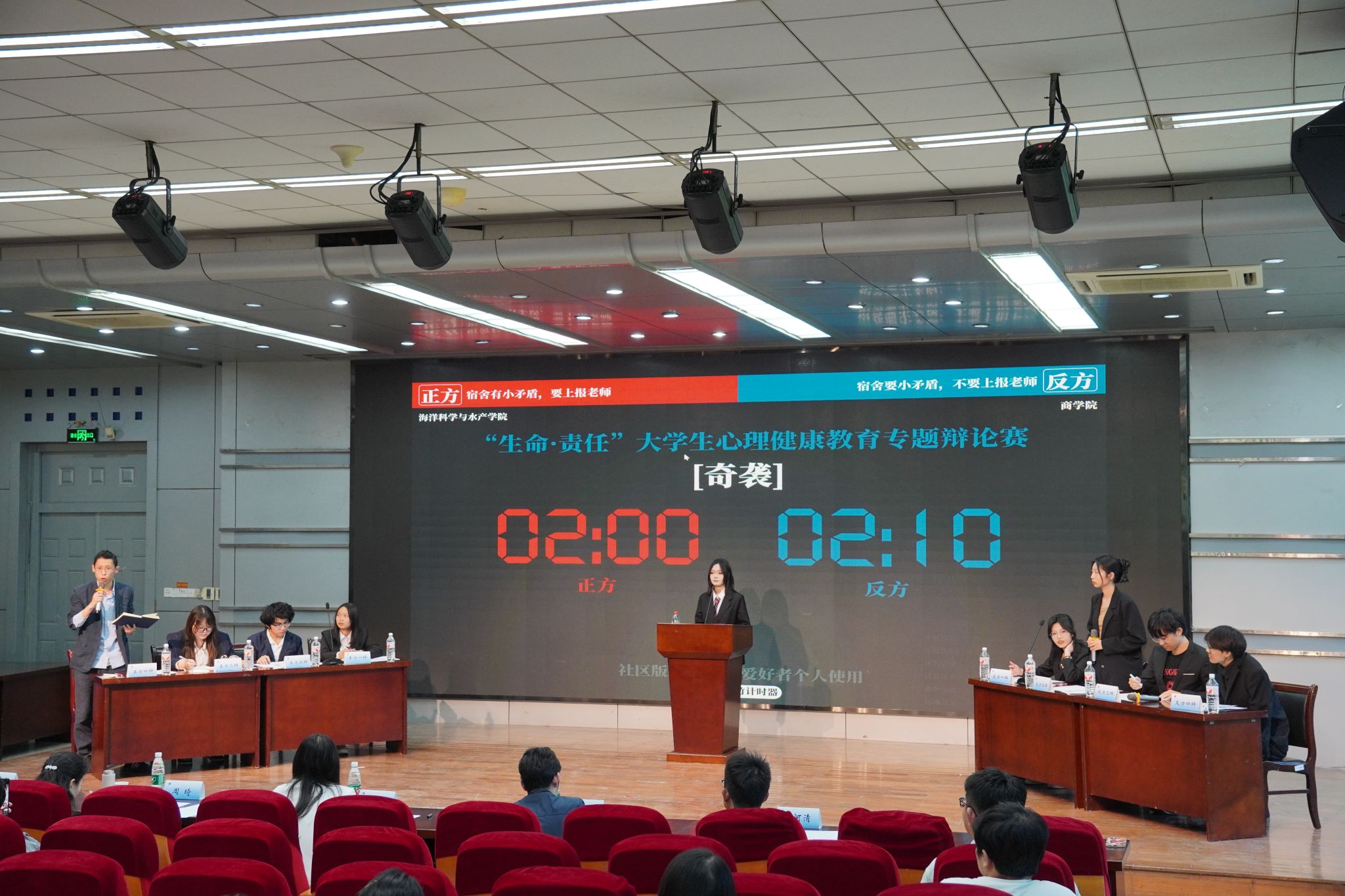 ,反方为商学院,辩题是"宿舍有小矛盾是否应该上报老师"。第二场正方为计算机工程学院,反方为环境与化学工程学院。第一场比赛结束,蒋莹莹作为评委进行点评,蒋莹莹指出作为大学生群体,宿舍矛盾如果解决不了应该立即报告老师,老师也非常愿意为大家解决问题。第二场比赛结束后,周琦作为评委进行点评,周琦从双方辩手可以从哪些方面答辩进行指导,引导学生抓住关键点进行答辩。