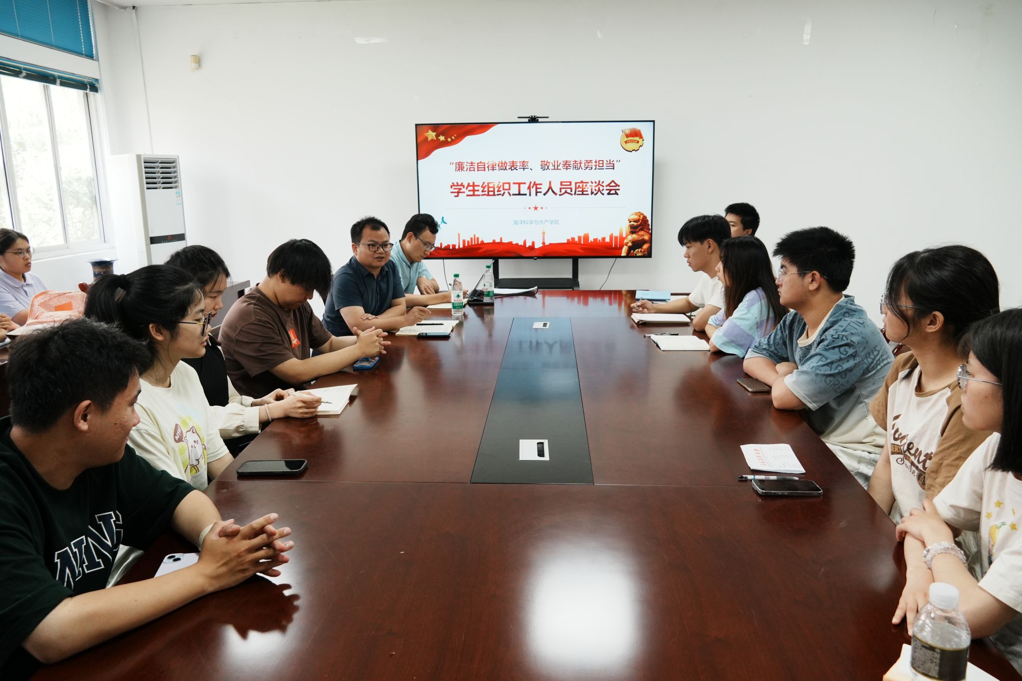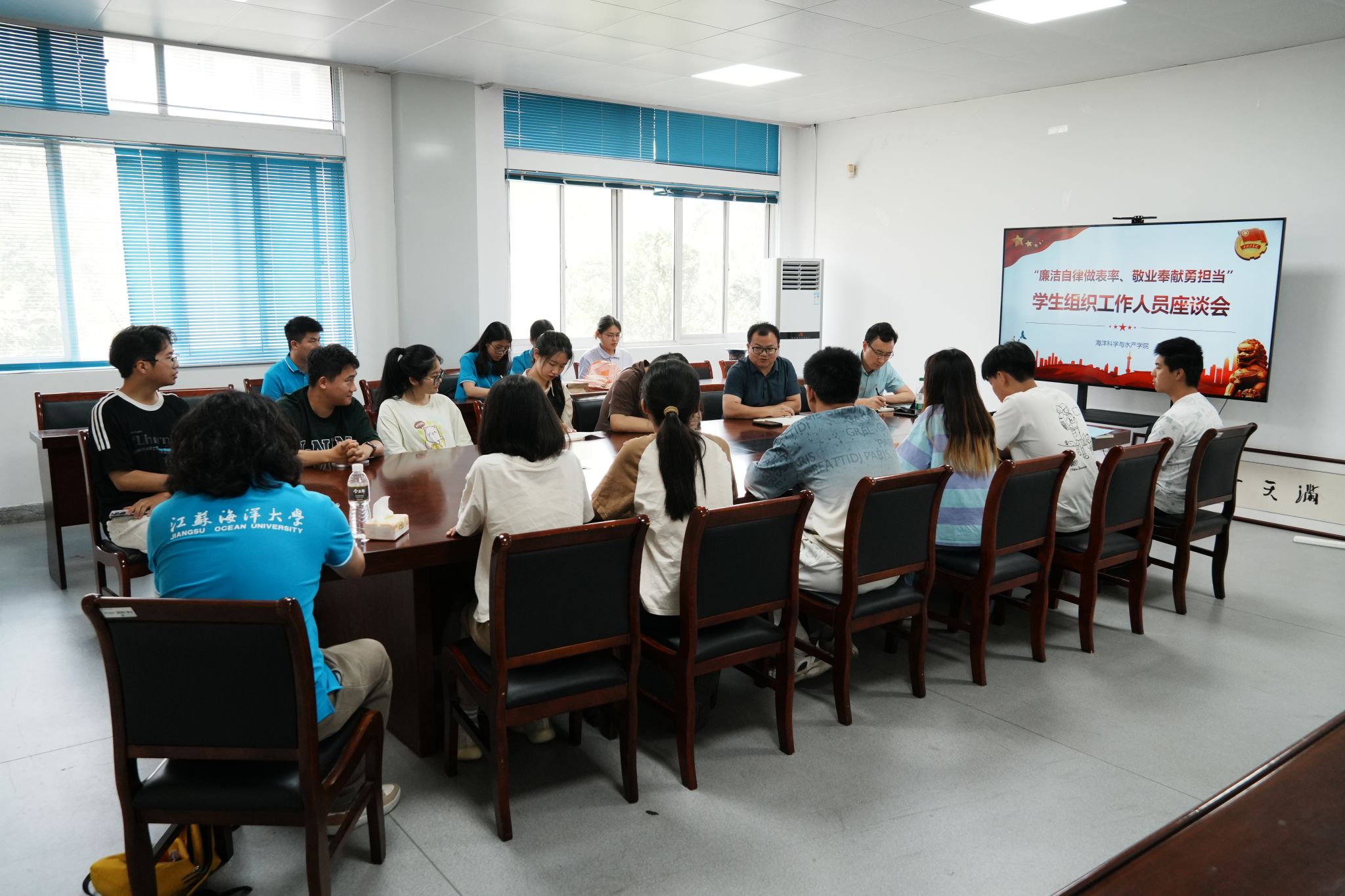 在海洋南楼211成功召开了一场学生组织工作人员座谈会。活动旨在加强学院团学组织的建设,进一步推动学院团学工作的高质量发展。学院党委副书记朱小明、团委书记唐振新及团学组织学生骨干参加座谈会。