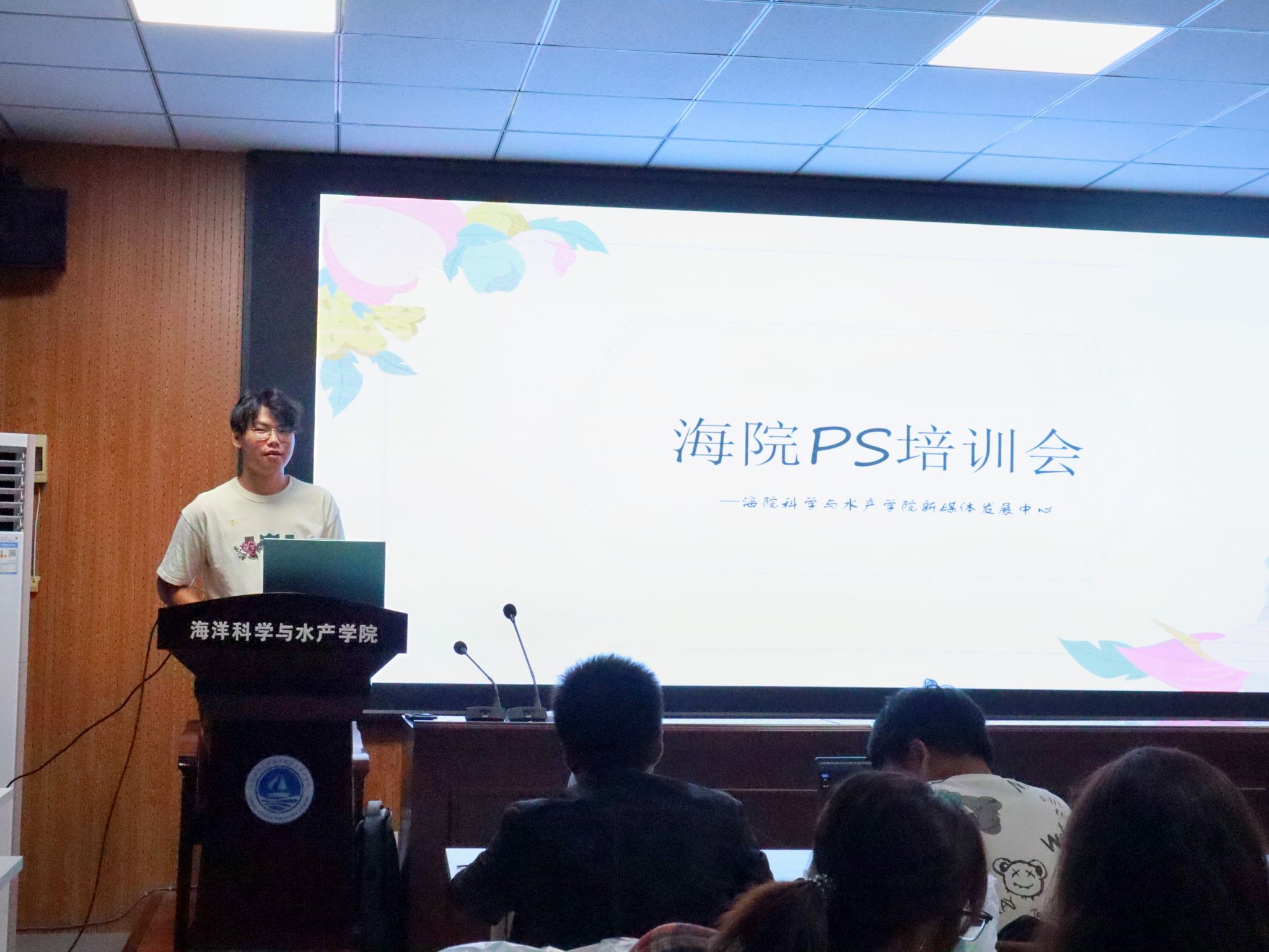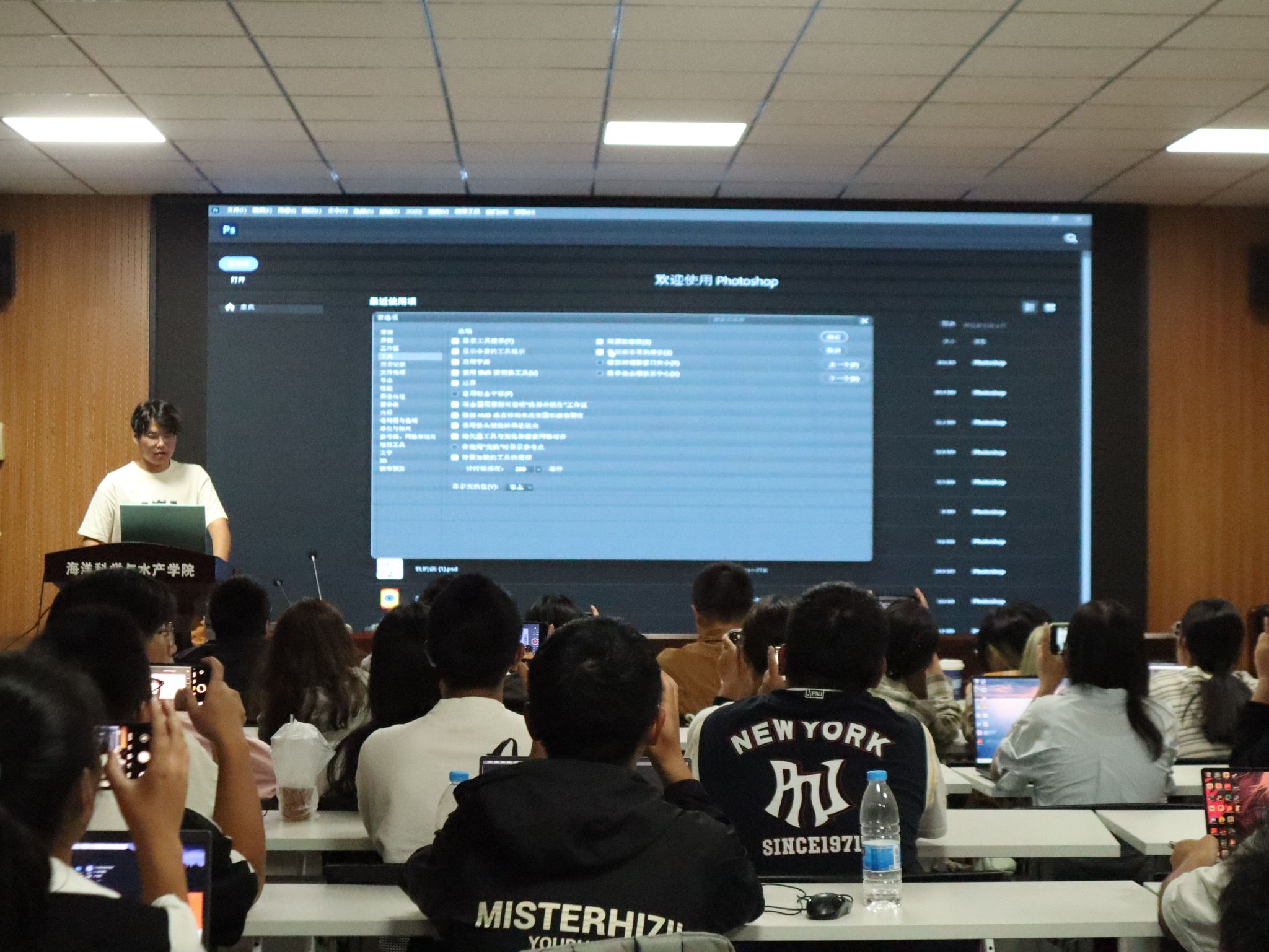 在海洋南楼203室成功举办新闻稿采编及PS技术培训会。培训会分别由新媒体网宣部汤豪及潮编部薛德培担任主讲。