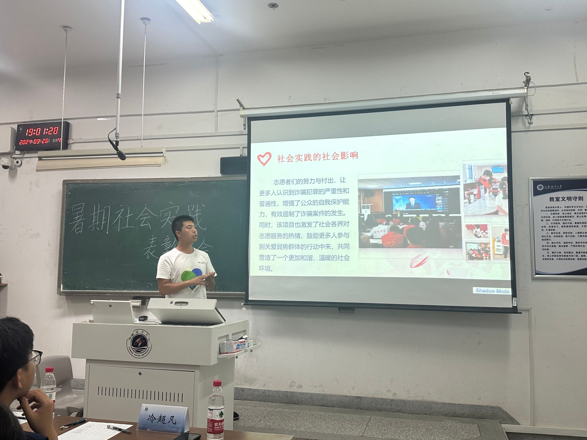 会议伊始,蒋恢晨对活动流程进行了讲解说明,并公布了评分标准。“青春奋进,博爱与你”实践项目的主讲人帅文博率先登台进行项目汇报,他通过生动的讲述和深入的剖析,展示了他们团队如何利用多种方式开展科普宣传,提高民众禁毒防艾意识,他们用行动、用青春诠释了博爱奉献精神。随后,“破雾识真共筑反诈堡垒”项目宣讲人以鲜明的事例和深入浅出的讲解展示了他们的实践成果,更为在座同学们揭示了诈骗的严重危害。他们深入医院、商场、基层社区等地开展反诈宣传,提醒更多人关注人身财产安全,号召社会提高对弱势群体的关注保护。