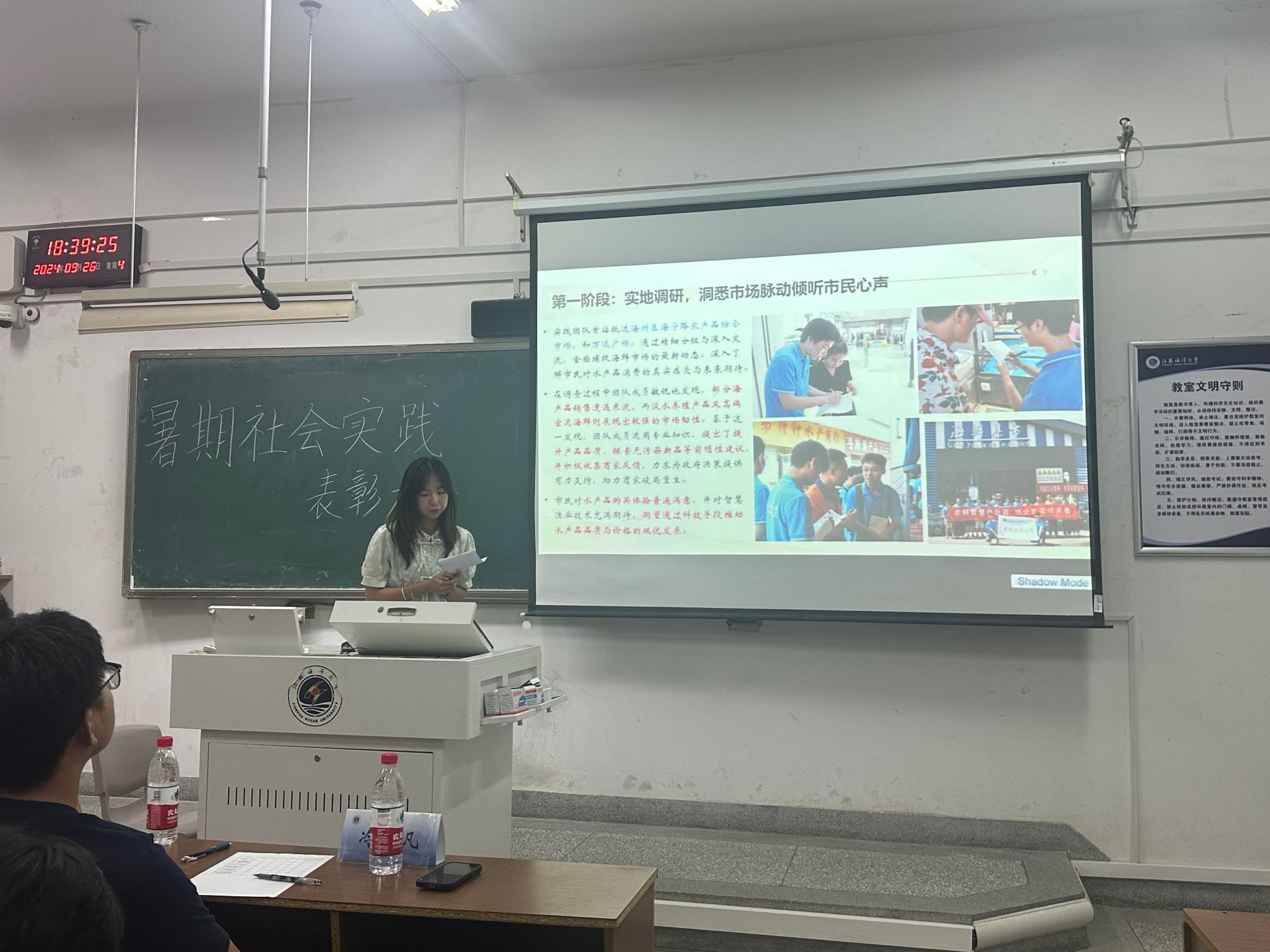 海洋科普暑期社会实践团队则从项目背景意义、项目内容、项目成果等三个方面为同学们全面介绍了今年海洋科普实践活动。他们积极科普海洋知识,依托新媒体技术传播优势,积极投身海洋生态环境保护,助力海洋强国建设。六个实践团队依次汇报展示后,评委们对各实践团队项目成效进行了公平公正的打分,多支院级优秀实践团队脱颖而出,获得了荣誉,赢得了掌声。