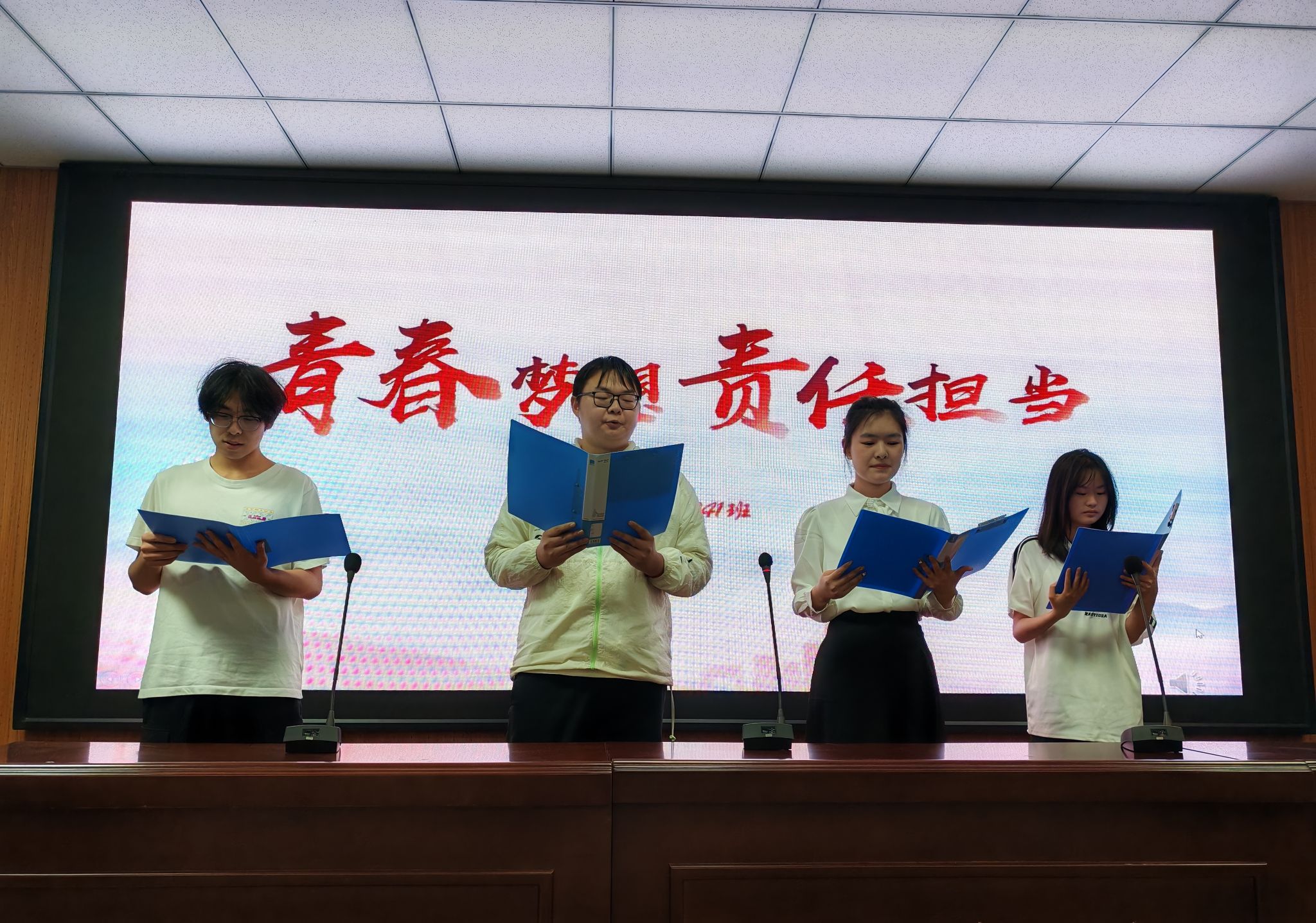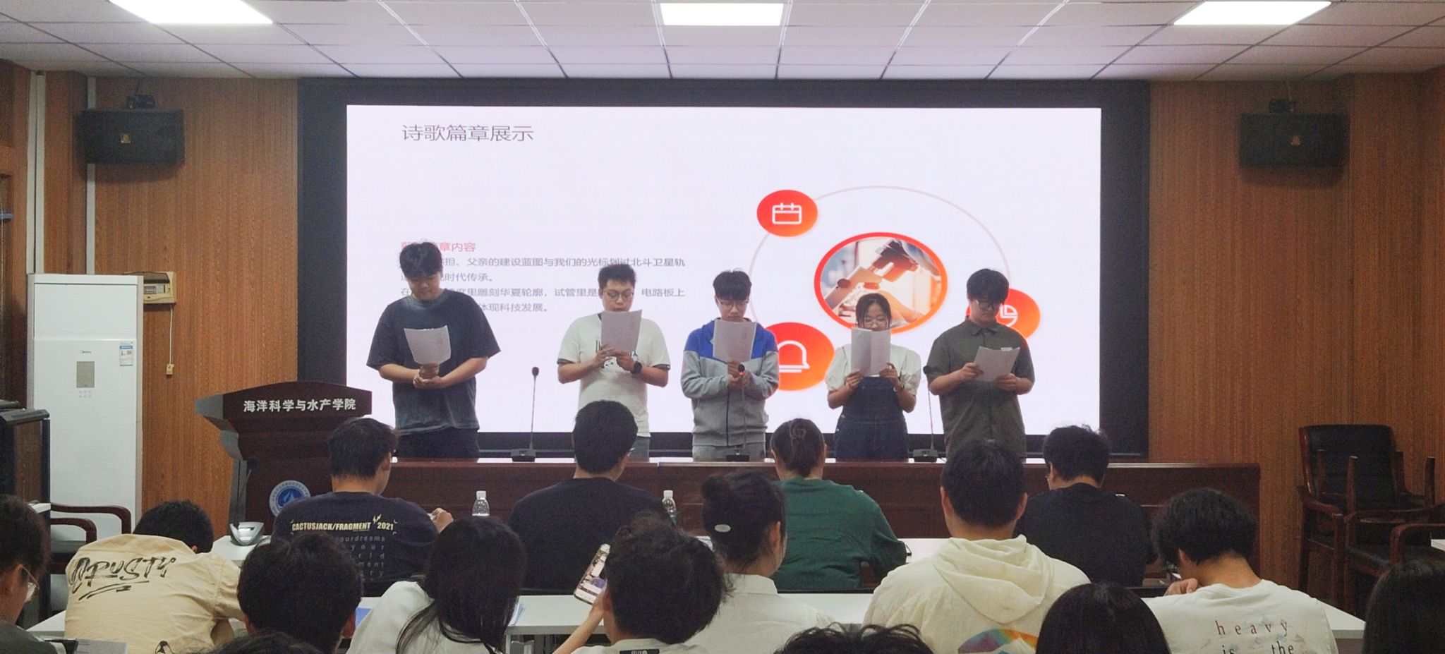 在海洋南楼203室成功举办"以青春之名,担时代之责"爱国主题诗歌朗诵赛。全院大一学生以班级为单位参与角逐,学院团委书记唐振新、学生团委副书记李燕婷、学生党员工作站负责人虞文涛及学院团委组宣部代表袁立博担任评委。