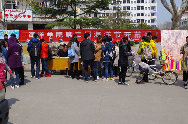 在这春意盎然、万物复苏之际,海洋学院迎来了第二届海洋节,并于2015年4月10日中午在一食堂前火热拉开序幕。本届海洋节将在接下来一个月开展“海上护卫队”、“走进海洋世界”、“爱心鱼寄养”、“食物心语面包制作大赛”、“蛋糕裱花大赛”、“海英辩论赛”、“海洋科普知识问答”、“海洋活力彩虹跑”等丰富多彩的活动。