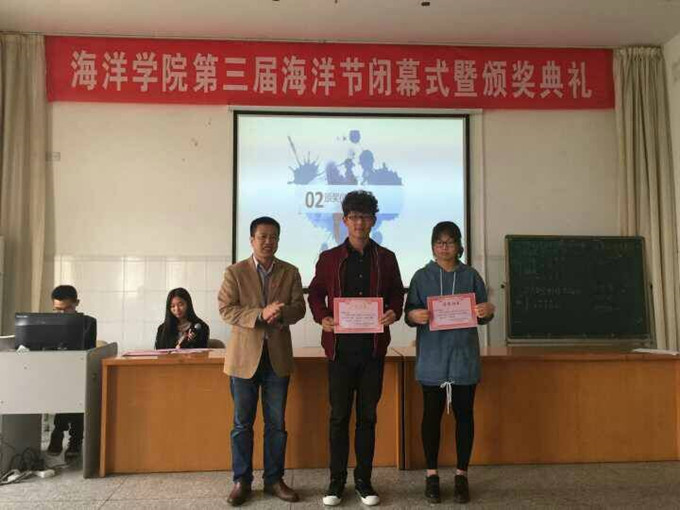 5月27日中午,由海洋学院主办的第三届海洋节闭幕式暨颁奖典礼在海洋北楼308隆重举行。本次海洋节活动紧紧围绕“发扬海院文化,打造海洋特色”的主题,紧密结合“蓝色海洋,绿色未来”的活动理念,开展了一系列海洋特色鲜明校园文化活动。出席本次闭幕式的嘉宾有海洋学院党委副书记马志同、辅导员王静及来自各学院的获奖代表。
