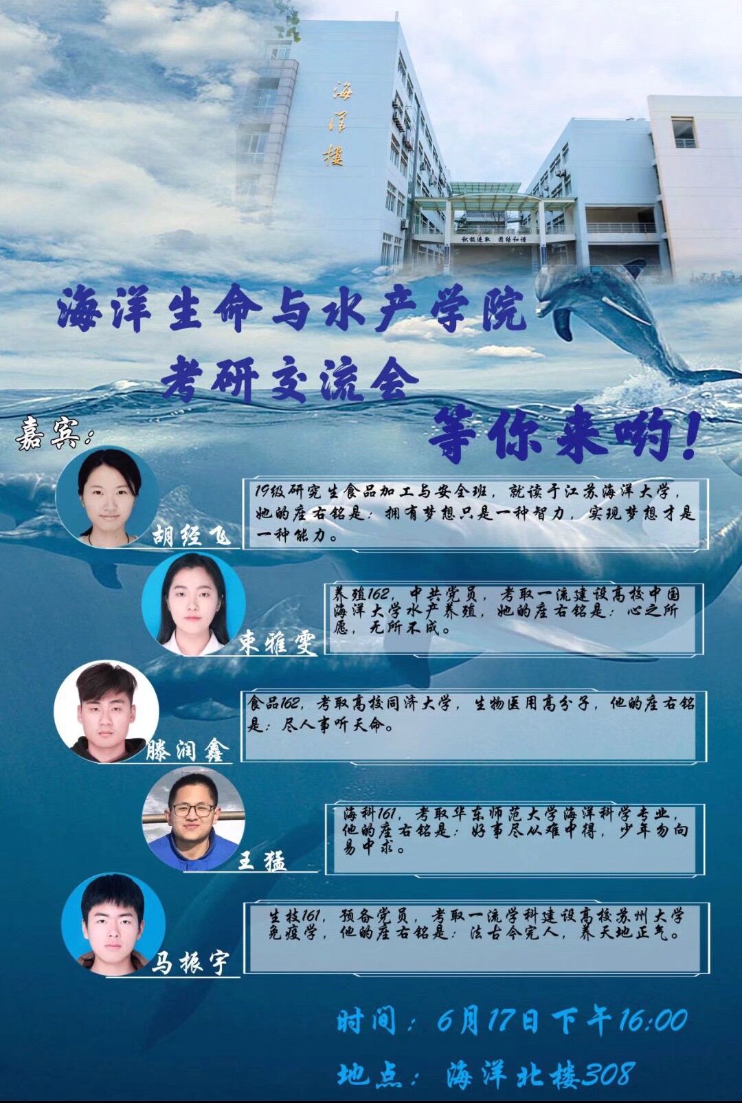 6月17日下午4时,海院学生会在海洋北楼308举办了“研途铸梦 自强不息 经验交流 拨云见日”主题考研交流会,面向有考研意向的学子分享考研成功经验,帮助他们解除困惑,达到拨云见日效果。活动邀请食品加工与安全专业研究生胡经飞、本届考研成功的杰出代表——束雅雯、滕润鑫、王猛、马振宇及海院辅导员韩振出席,交流会由院团委副书记唐振新主持。
