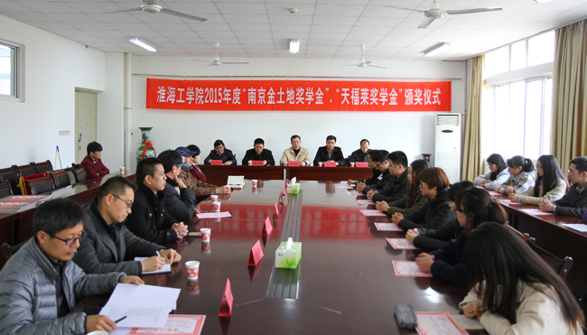 3月23日下午,淮海工学院2015年度“南京金土地奖学金”、“天福莱奖学金”颁奖仪式在海洋学院二楼会议室举行。校党委副书记、纪委书记史顺良、学生处处长汤洪涛、南京金土地生物技术有限公司副总经理唐向阳、江苏天福莱集团有限公司总裁助理王晓明、人力资源部副经理赵雪君、海洋学院党政负责人及20名获奖同学参加了颁奖仪式。海洋学院院长阎斌伦同志主持会议并致欢迎词。